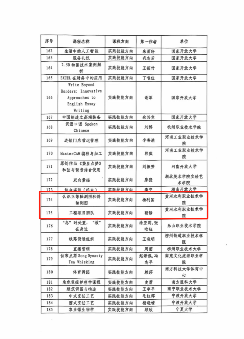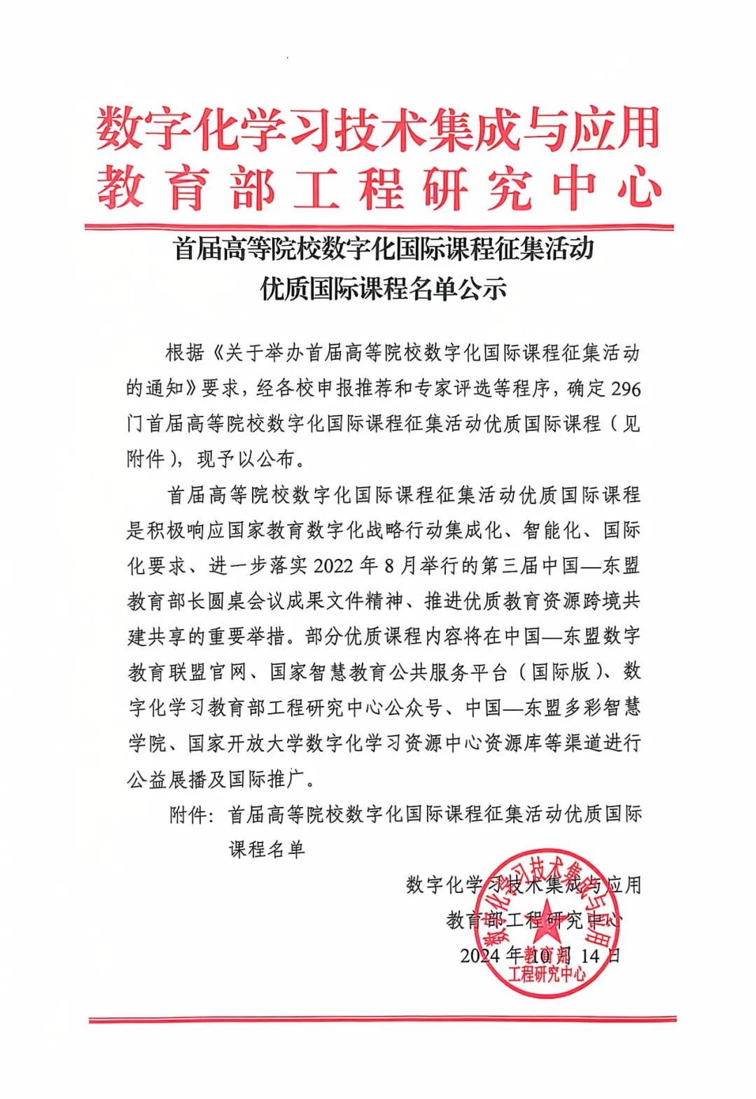 近日,数字化学习技术集成与应用教育部工程研究中心公布了“首届高等院校数字化国际课程征集活动优质国际课程名单”,由我院教师杨利国主讲的《认识正等轴测图和斜轴测图》和靳静主讲的《工程项目团队》2门课程入选。