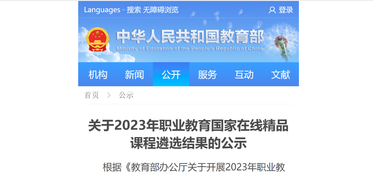 2023年职业教育国家在线精品课程遴选结果的公示: