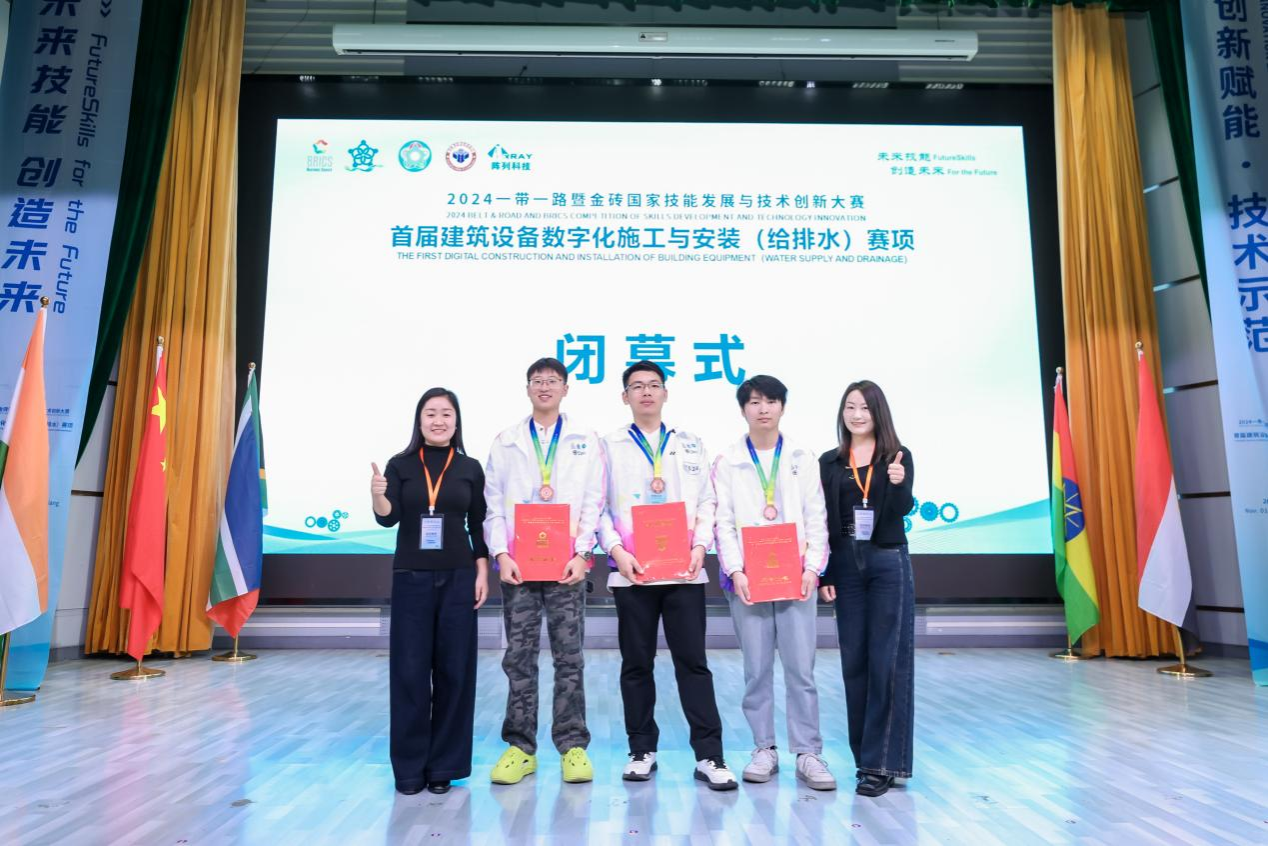 11月1日—3日,2024一带一路暨金砖国家技能发展与技术创新大赛首届建筑设备数字化施工与安装(给排水)赛项在浙江建设职业技术学院举行,来自全国31个省(自治区、直辖市)的149支代表队同台竞技。经过激烈角逐,由我院教师李玲玲、张斯琪指导,给排水工程技术专业学生张泽裕、赵文豪、陈孝廷组成的参赛团队荣获三等奖。