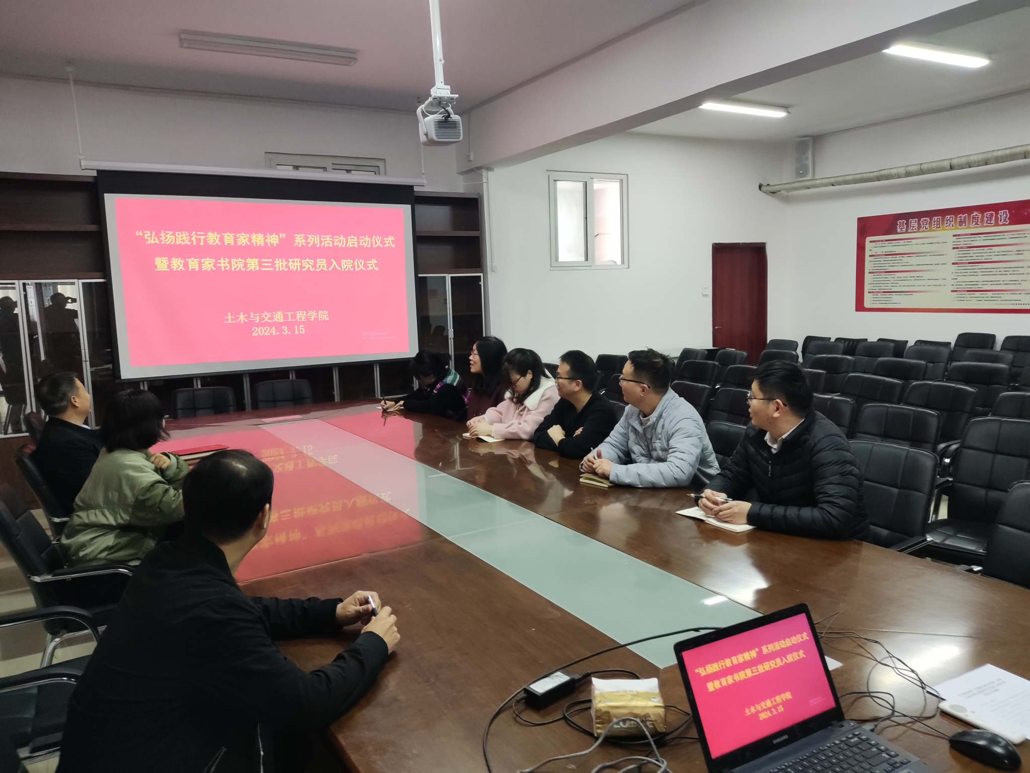 2024年3月15日,土木与交通工程学院积极响应河南省教育厅号召,组织部分教职工代表,在学院会议室集中观看“弘扬践行教育家精神”系列活动启动仪式暨教育家书院第三批研究员入院仪式的现场直播。此次活动由河南省教育厅主办,河南大学、河南教育家书院、河南省师德建设宣传中心联合承办。
