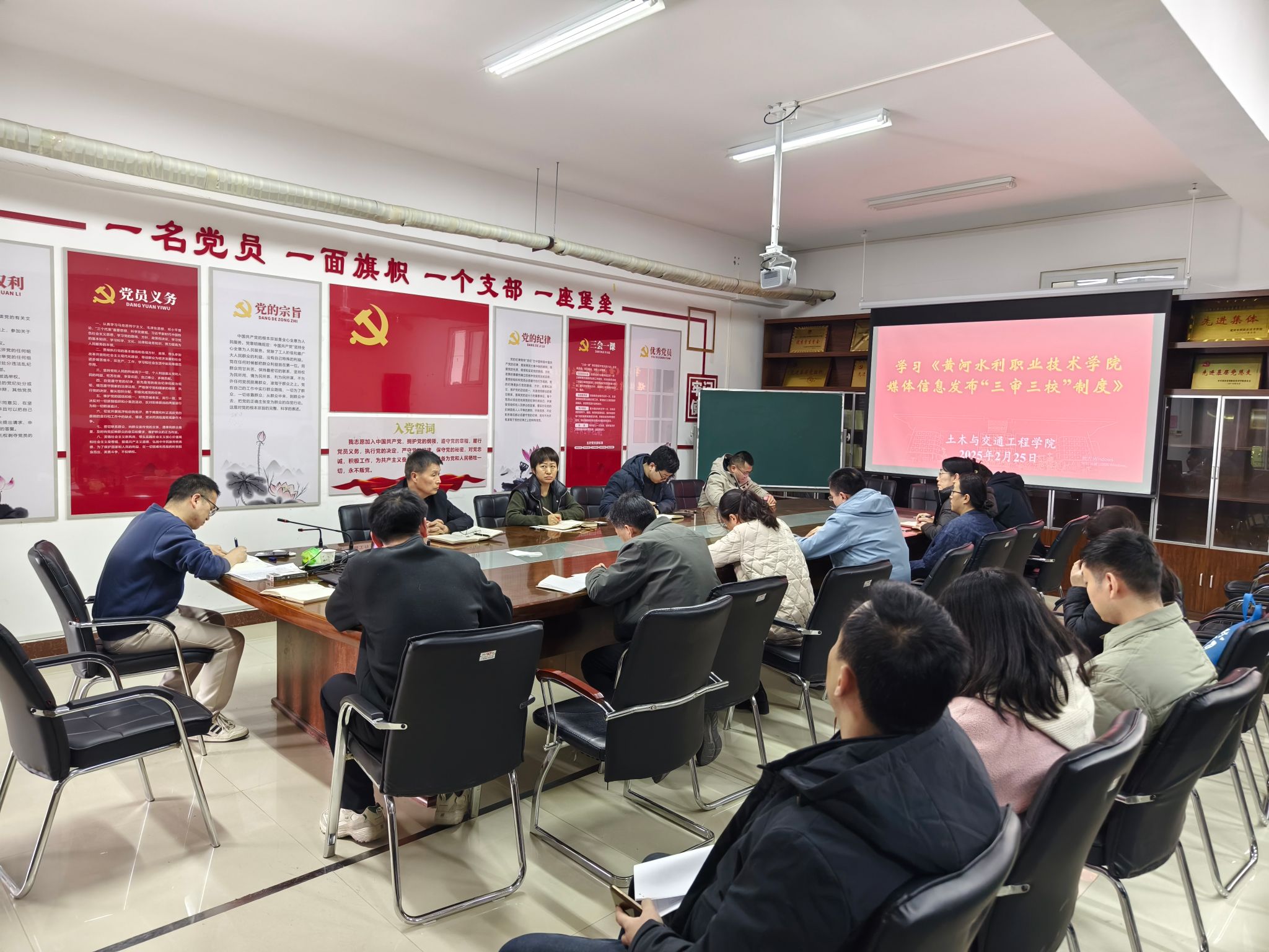 为贯彻落实《黄河水院2025年上半年政治理论学习及思想道德教育计划》学习要求,进一步提升教职工理论学习的制度化和规范化水平和政治理论素养。2月25日,土木与交通工程学院组织教职工专题学习全省安全稳定、教育工作会议精神,学校新学期安全工作会议精神和学校媒体信息发布“三审三校”制度。