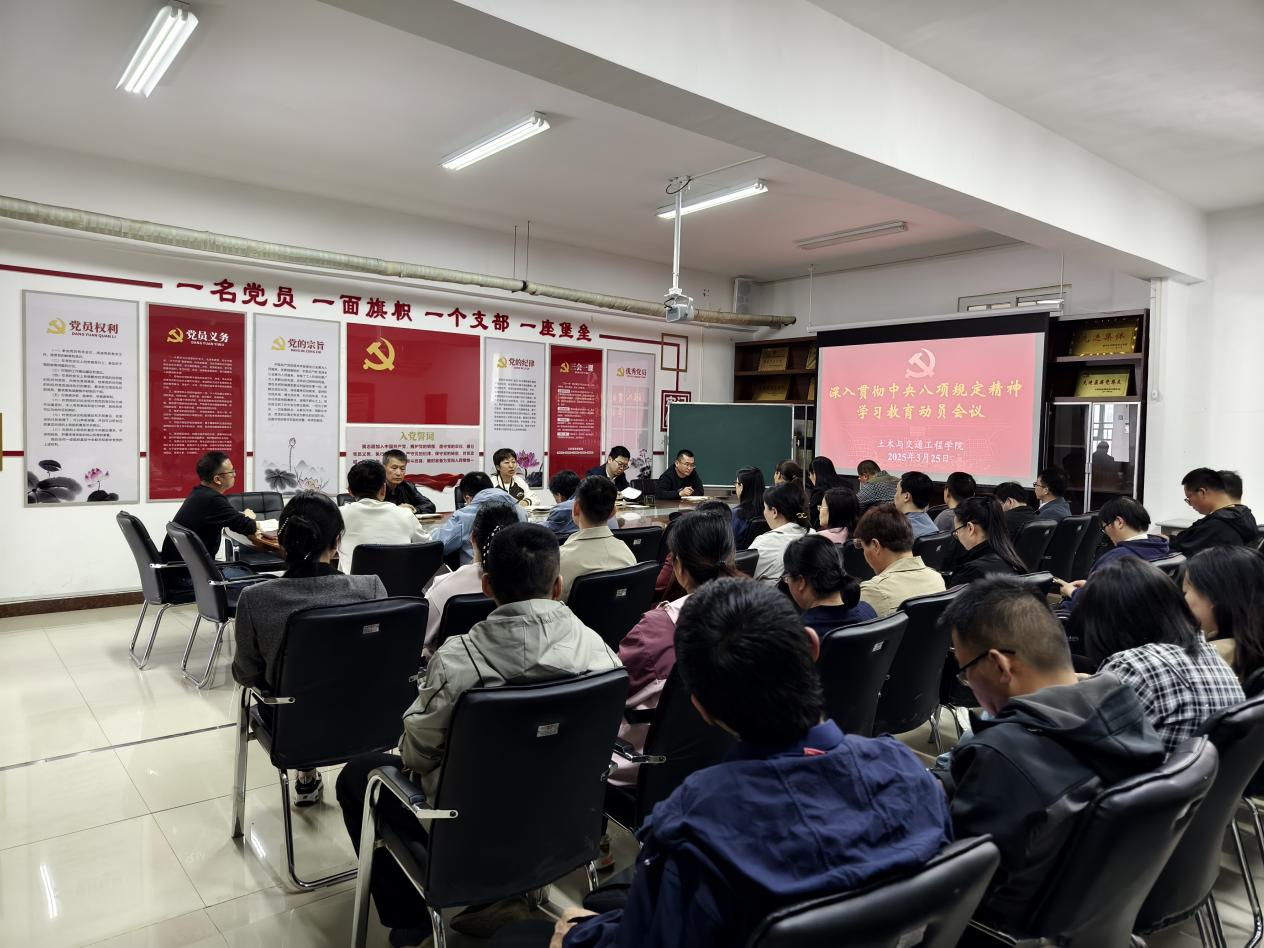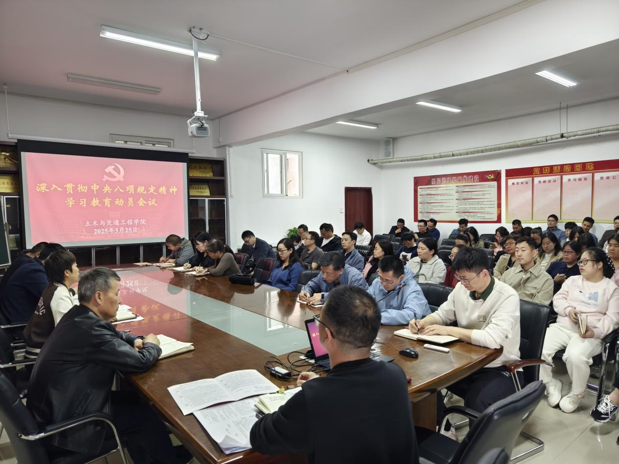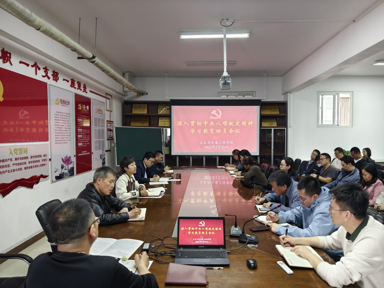 3月25日,土木与交通工程学院在SY5319会议室召开深入贯彻中央八项规定精神学习教育动员部署会。学院领导班子成员、全体教职工参加会议,学院党总支书记耿亚杰主持会议。