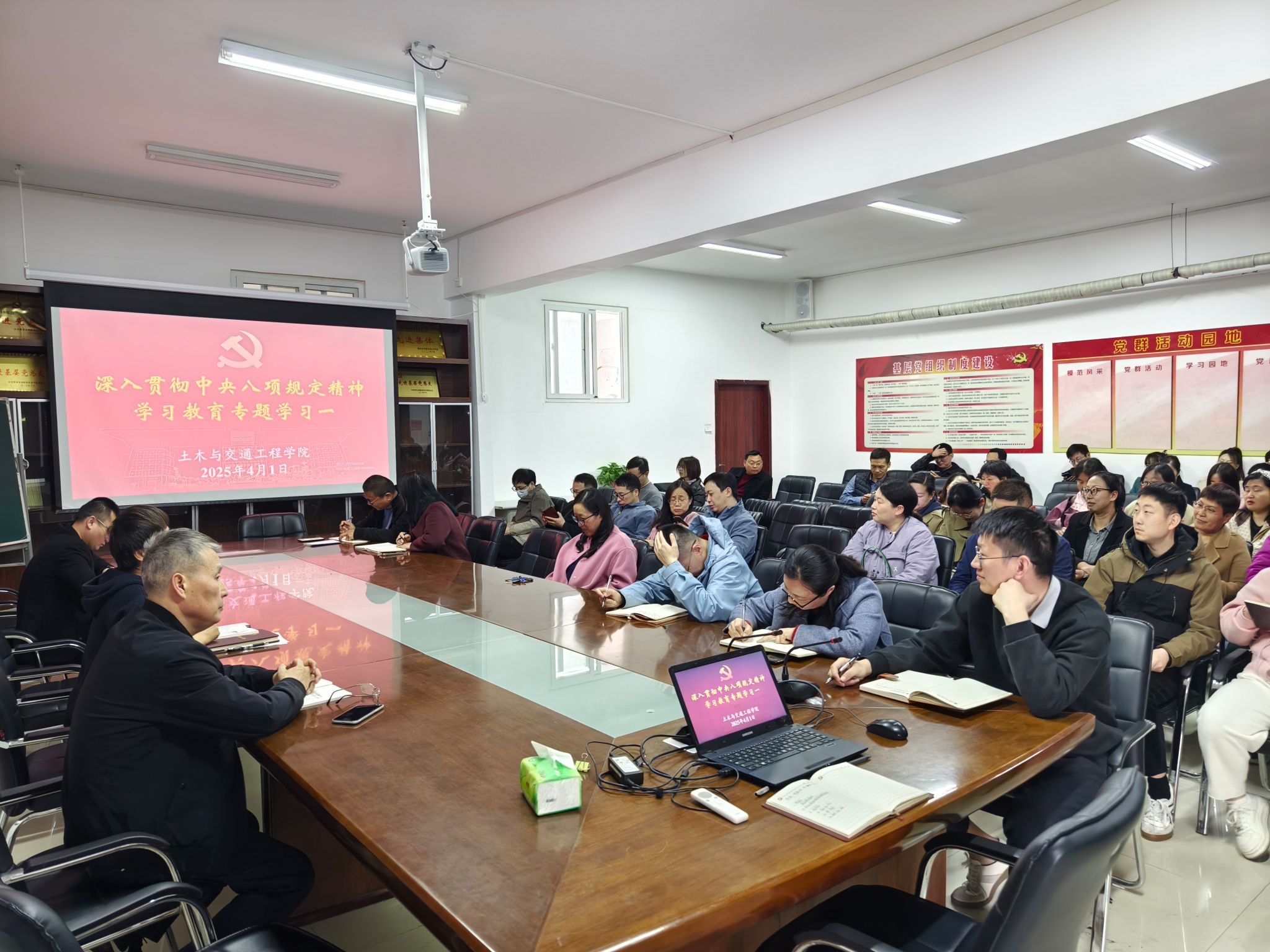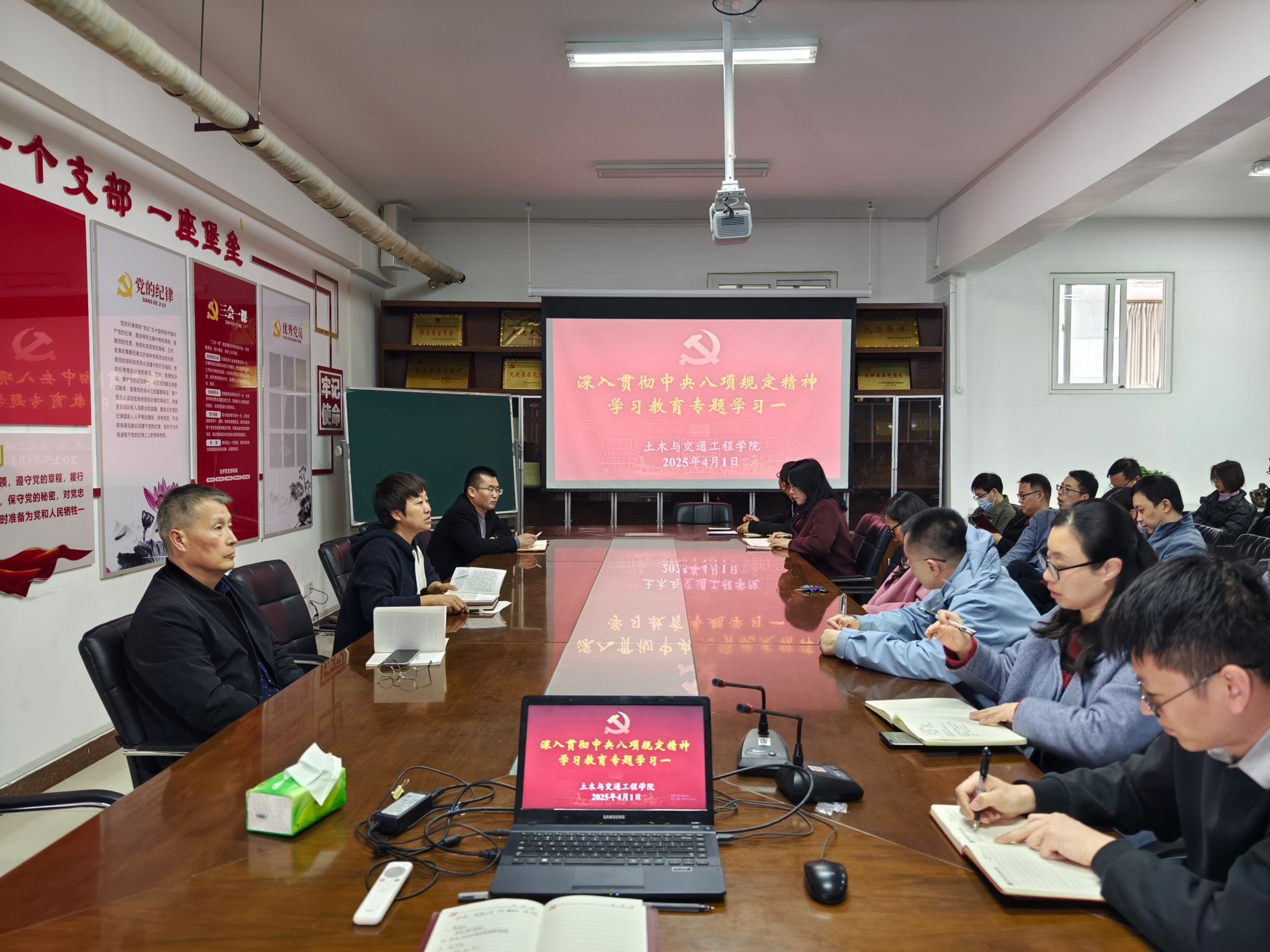 4月1日,按照开展深入贯彻中央八项规定精神学习教育总体安排,土木与交通工程学院举行深入贯彻中央八项规定精神学习教育第一次集中学习,围绕《习近平关于加强党的作风建设论述摘编》第一章、《十八届中央政治局关于改进工作作风、密切联系群众的八项规定》《中共中央政治局贯彻落实中央八项规定实施细则》等内容开展学习与交流研讨,切实将思想和行动统一到党中央的决策部署上来,不断增强贯彻落实中央八项规定精神的政治自觉、思想自觉、行动自觉。