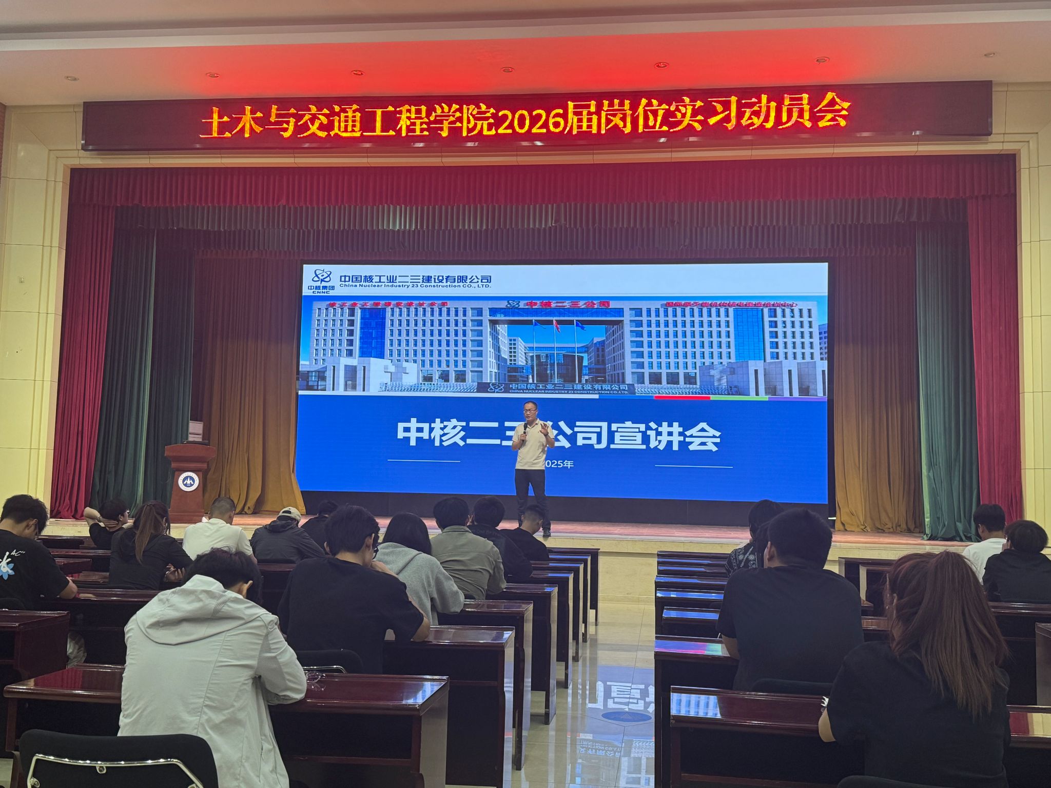在企业宣讲环节,中国核工业二三建设有限公司代表首先登台。作为国内核工程建设领域的领军企业,该公司重点介绍了其在土木、交通等领域的核心技术优势及发展前景,详细展示了面向2026届毕业生的实习岗位需求、工作内容及职业晋升通道。企业代表表示,希望通过实习合作发掘优秀人才,为行业高质量发展储备力量。