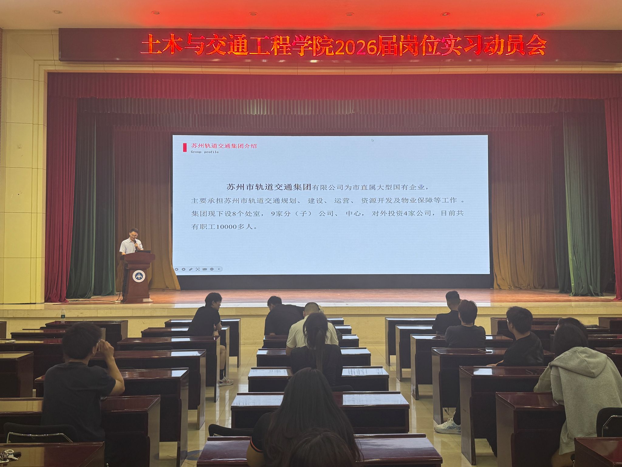 为帮助2026届毕业生更好地规划岗位实习工作,明确实习目标与要求,土木与交通工程学院于2025年6月7日下午在大学生活动中心召开“2026届毕业生岗位实习宣讲会”。学院领导、各专业教研室主任、辅导员、2026届全体学生及部分2025届学生代表共同参与了本次会议,会议特邀中国核工业二三建设有限公司、苏州市轨道交通集团有限公司(苏州地铁)两家企业进行宣讲,为毕业生提供实习政策解读与优质就业资源对接。