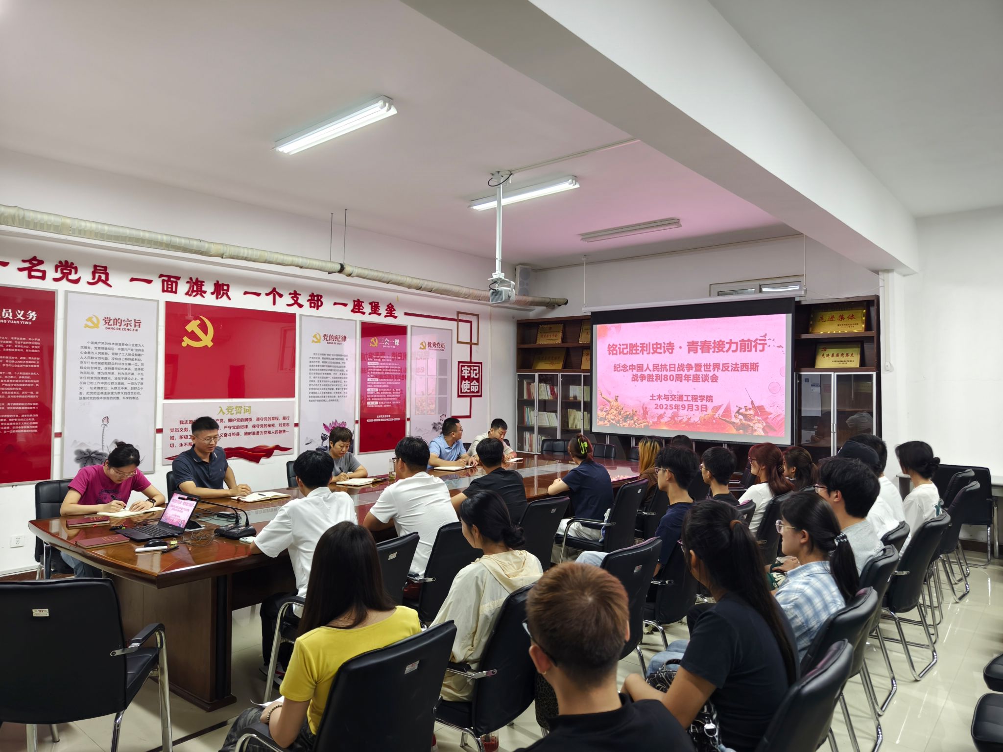 9月3日上午,土木与交通工程学院在5319会议室召开“铭记胜利史诗·青春接力前行”纪念中国人民抗日战争暨世界反法西斯战争胜利80周年主题座谈会。学院党总支书记耿亚杰、副书记孟宪金、分团委书记牛贺洋、辅导员及2024级各班团支书共同座谈。