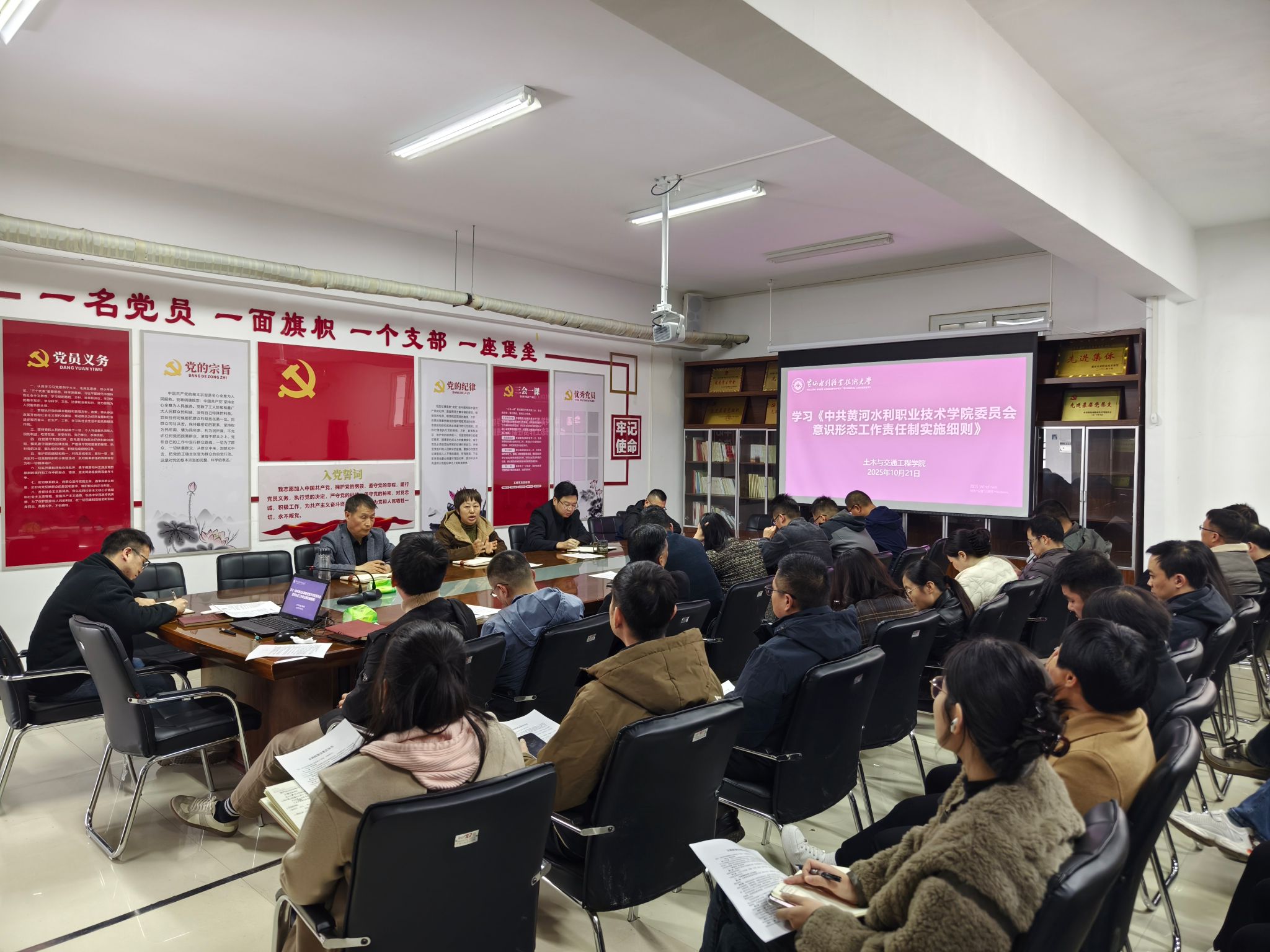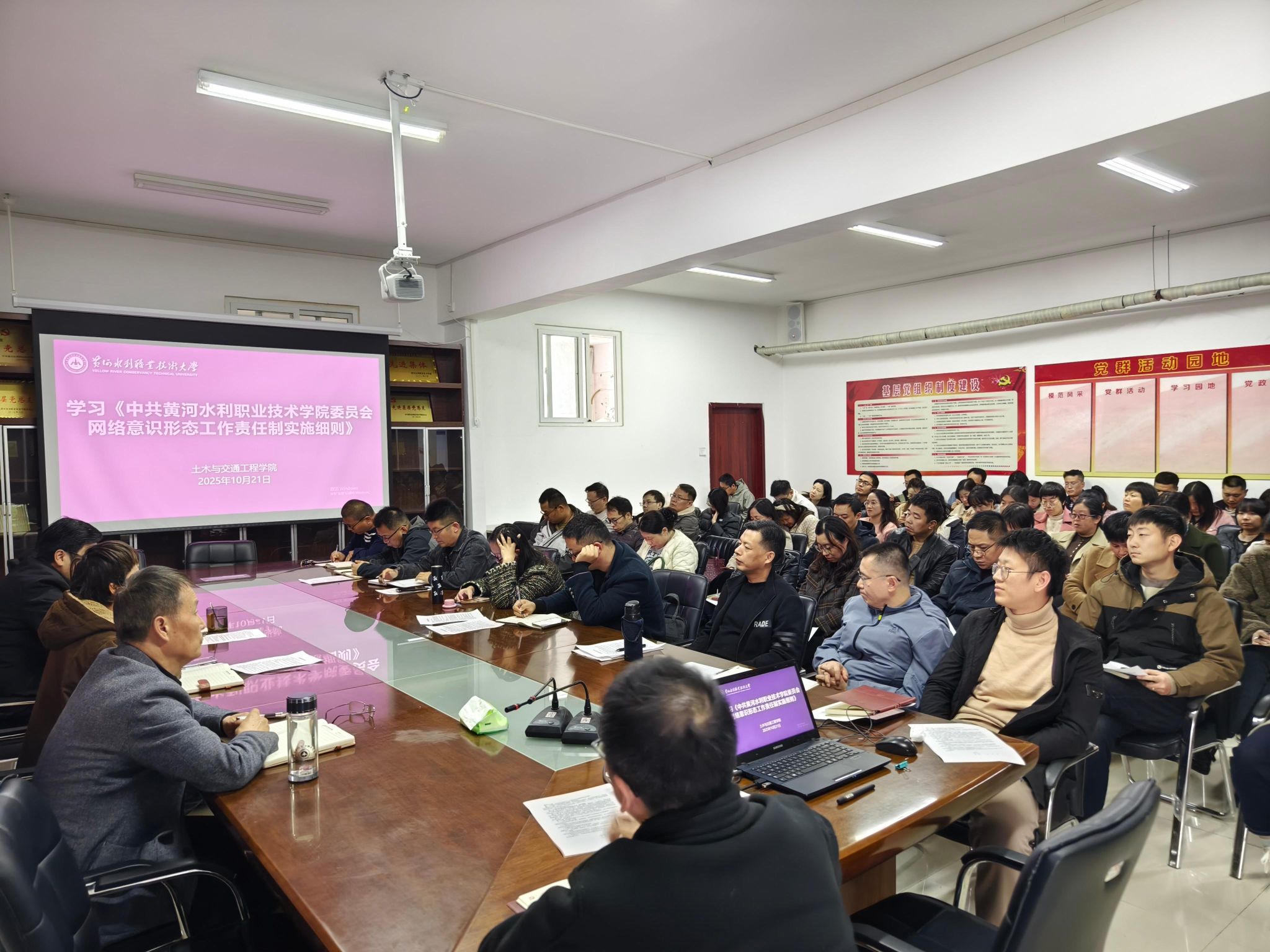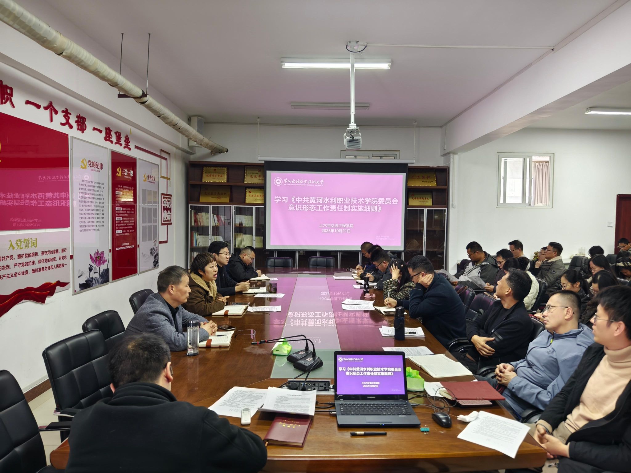 为贯彻落实《黄河水利职业技术大学2025年下半年政治理论学习及思想道德教育计划》学习要求,10月21日,土木与交通工程学院组织教职工传达学习《中共黄河水利职业技术大学委员会意识形态工作责任制实施细则》和《中共黄河水利职业技术大学委员会网络意识形态工作责任制实施细则》,引导教师切实将意识形态工作责任制贯穿立德树人全过程,切实肩负起意识形态工作的重任,为学校高质量发展营造良好的思想舆论环境。