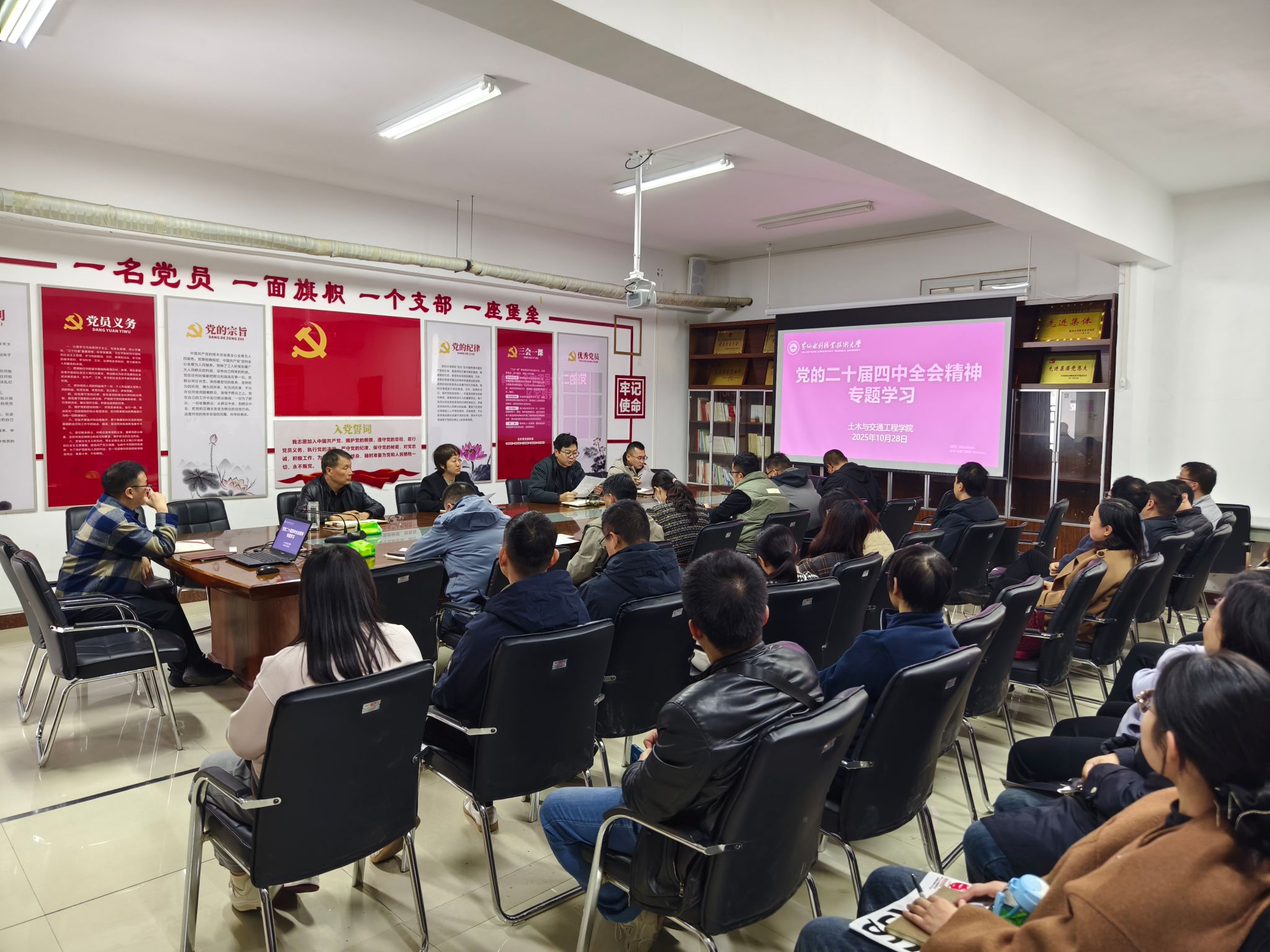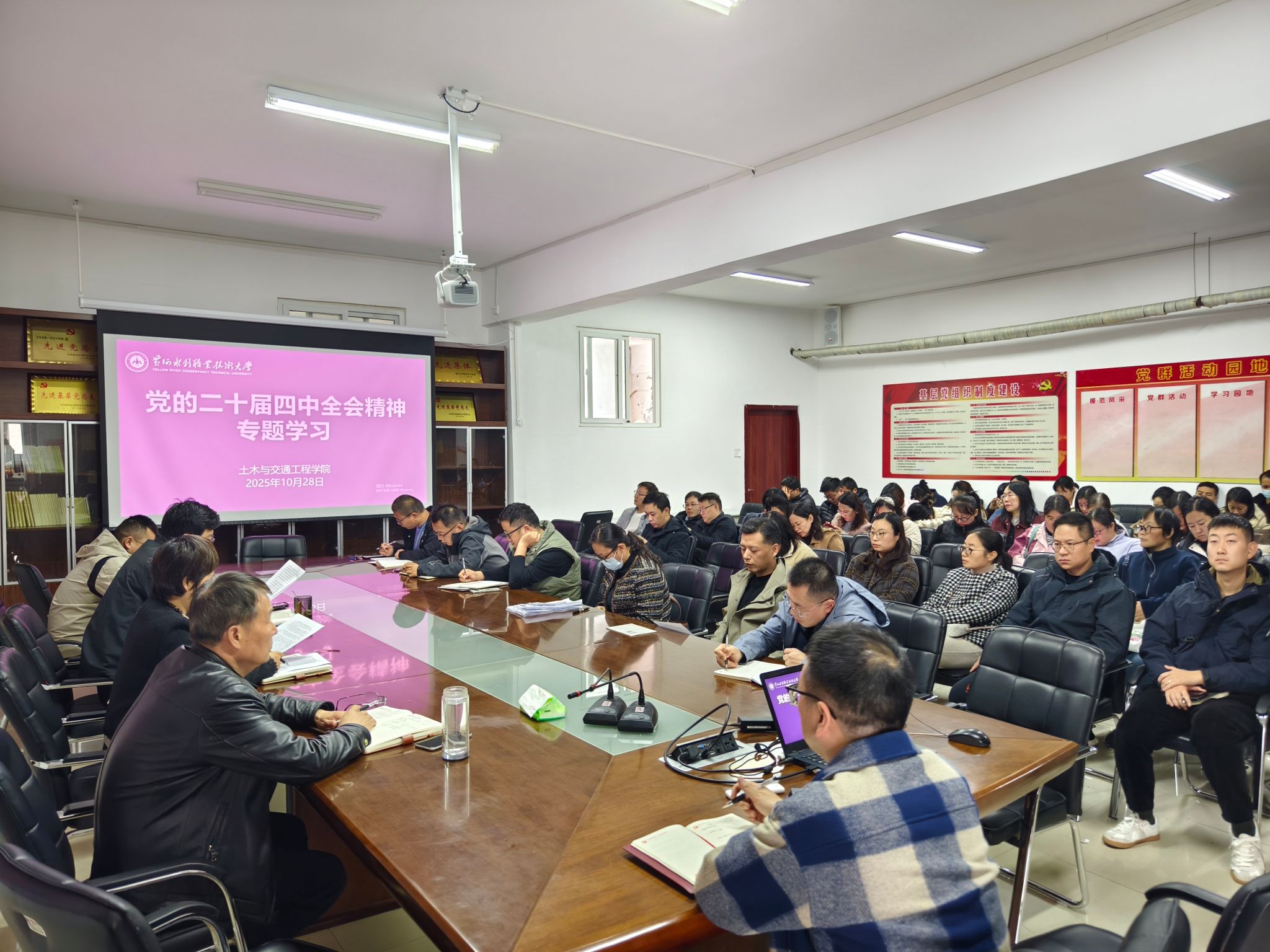 为全面学习好、宣传好、贯彻好党的二十届四中全会精神,将全会精神深度融入学校发展规划与实践推进各环节,用党的创新理论成果推动学校各项事业高质量发展,10月28日,土木与交通工程学院组织教职工传达学习《中共中央关于制定国民经济和社会发展第十五个五年规划的建议》《中国共产党第二十届中央委员会第四次全体会议公报》,切实将思想和行动统一到党中央的决策部署上来,在全院迅速掀起学习热潮。