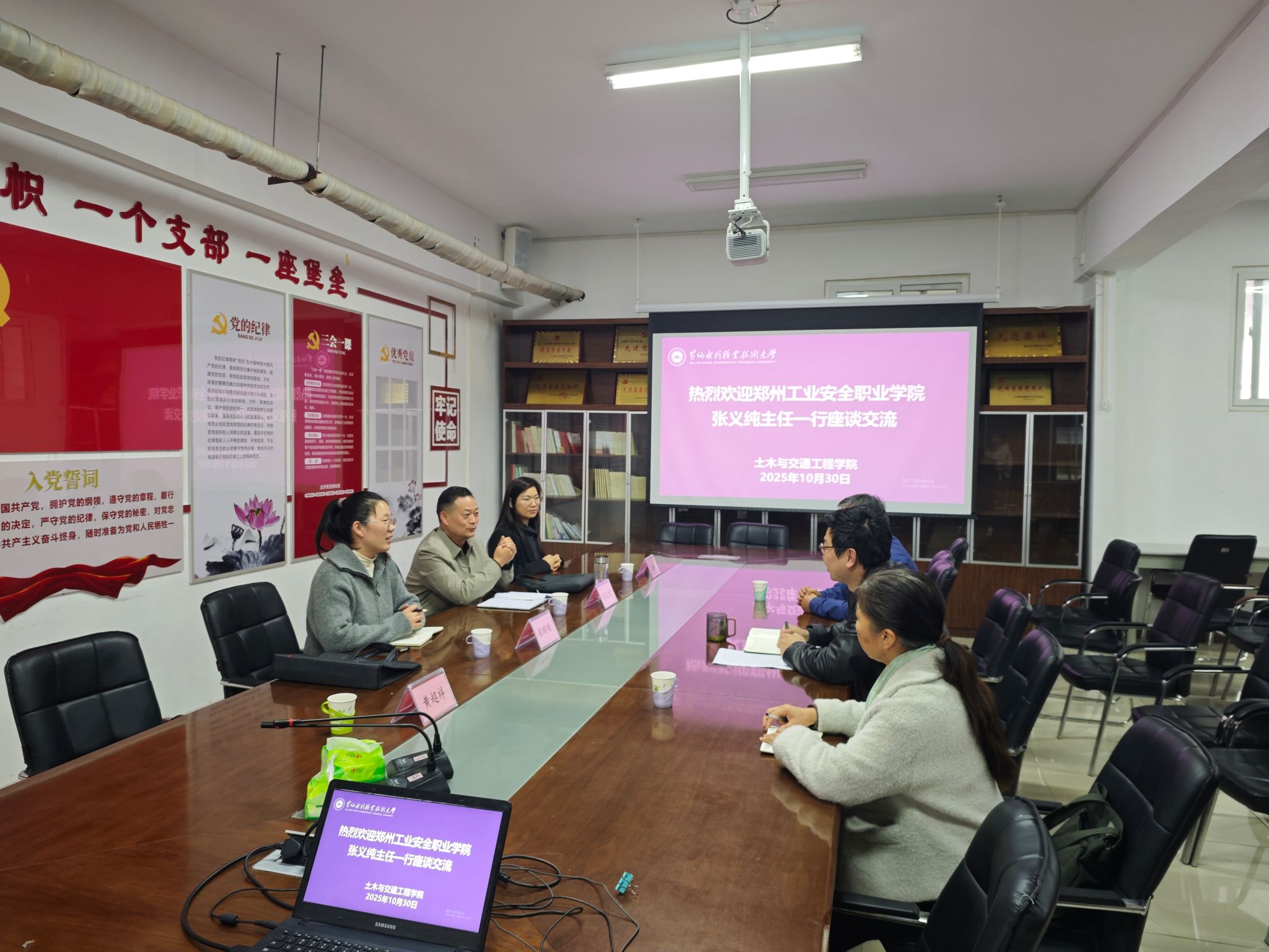 10月30日,郑州工业安全职业学院资源与环境工程系主任张义纯一行四人来我院开展调研交流。副院长职保平、道路桥梁教研室主任王娟玲参加了交流活动。