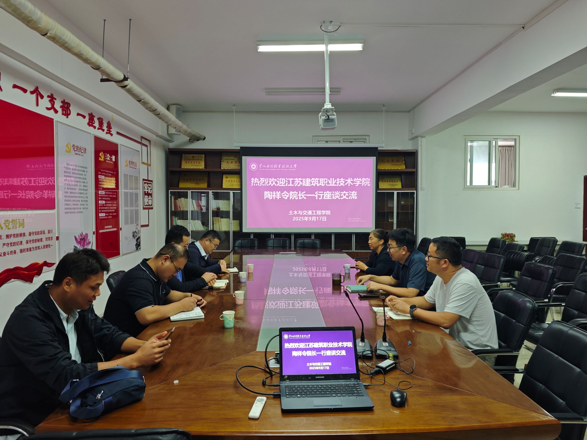 2025年9月17日,江苏建筑职业技术学院交通工程学院院长陶祥令一行来我院交流调研,重点就实训室建设、职业本科专业设置与建设、产教融合等方面开展深入交流。我院副院长职保平出席座谈会,道桥教研室主任王娟玲、骨干教师任永明参加座谈。