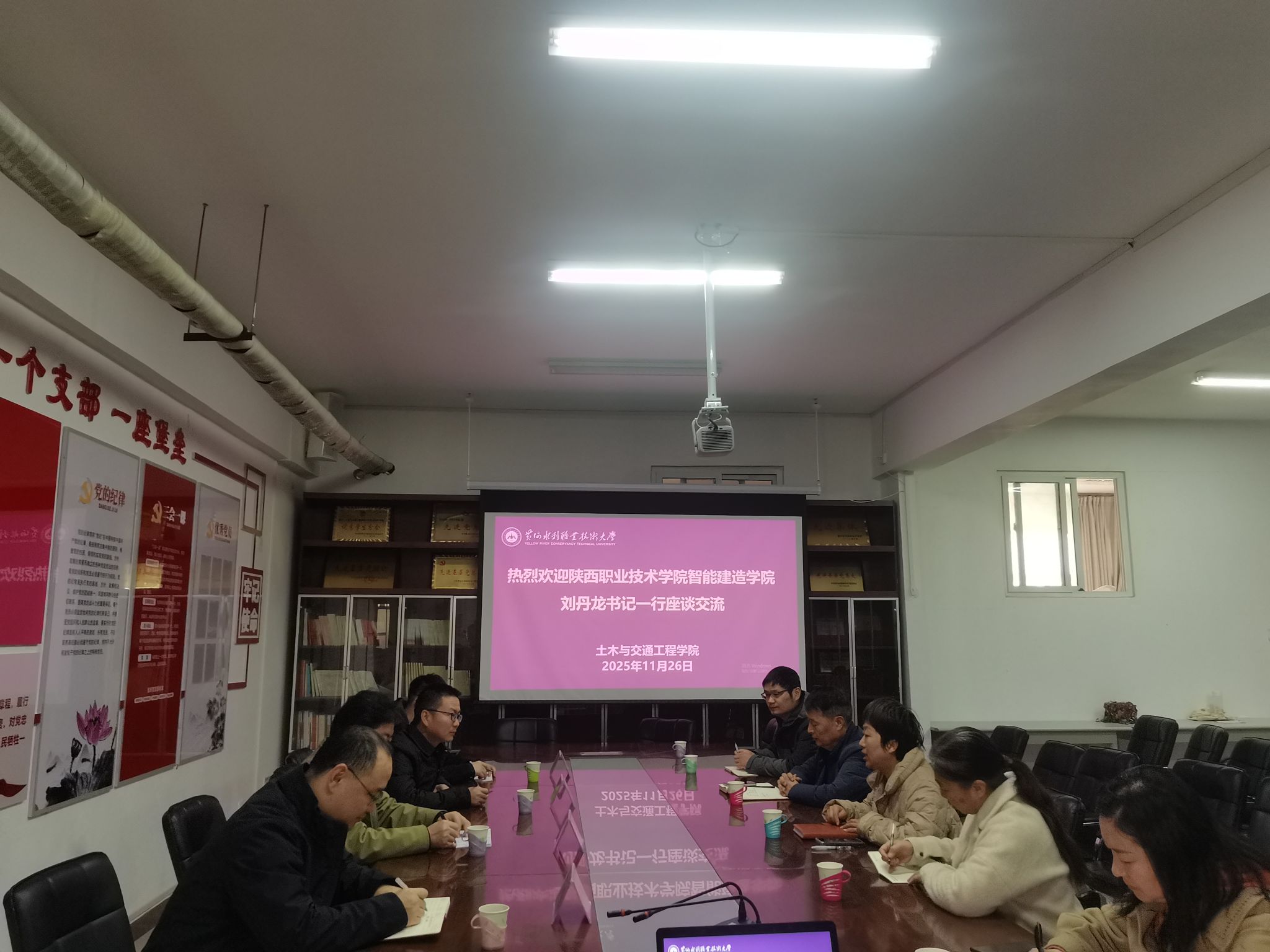 2025年11月26日,陕西职业技术学院智能建造学院党总支书记刘丹龙一行来我院调研交流。我院党总支书记耿亚杰、副院长侯根然出席座谈会,道桥专业负责人及骨干教师参加座谈。