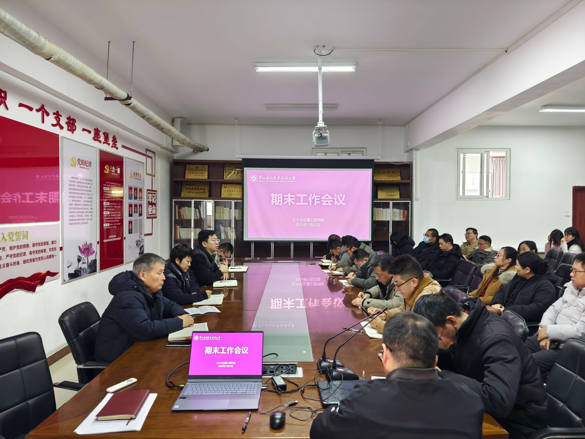 2026年1月22日,学院期末工作会议在会议室SY5319召开,全体教职工参会。