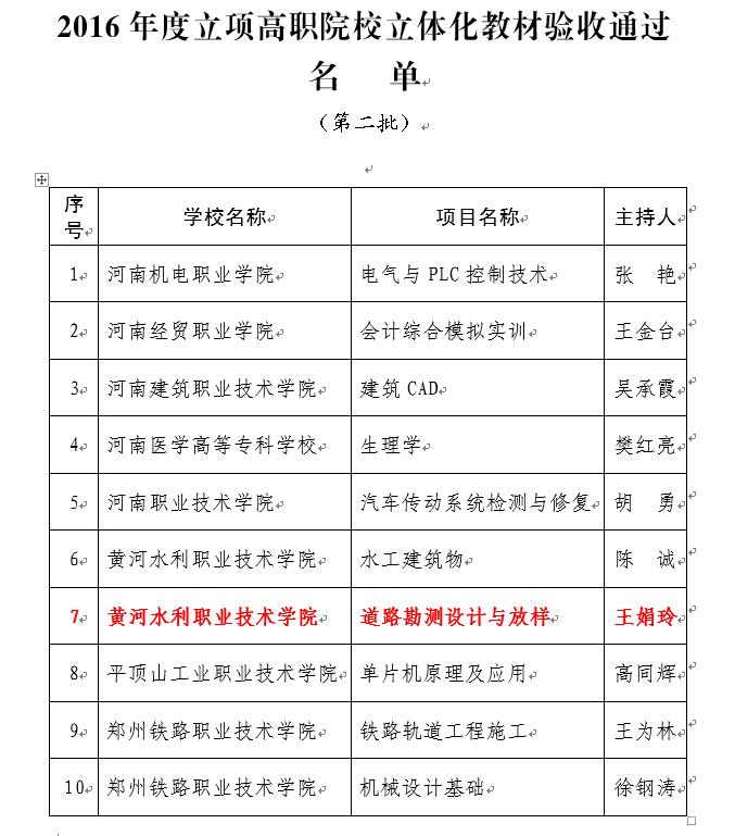 2018年1月16日,河南省教育厅教高〔2018〕40号文《河南省教育厅关于公布2016年度立项高职院校立体化教材第二批验收结果的通知》发布,我院王娟玲老师主持的高职院校立体化教材项目《道路勘测设计与放样》验收通过。