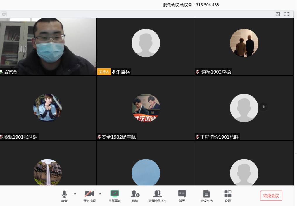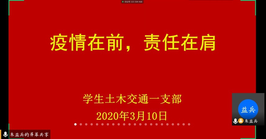 3月10日下午,土木与交通工程学院学生土木交通一支部利用腾讯会议,开展“疫情在前,责任在肩”主题党日活动。支部全体党员和入党积极分子参加,活动由支部书记孟宪金主持。