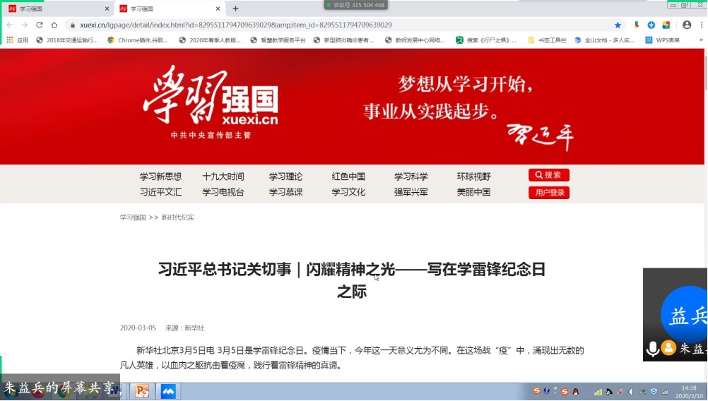 辅导员朱益兵老师号召支部老师和同学开展“学雷锋、抗疫情”活动。习近平总书记指出,我们既要学习雷锋的精神,也要学习雷锋的做法,把崇高理想信念和道德品质追求转化为具体行动,体现在平凡的工作生活中。朱老师通过“学习强国”网站系统报道,向老师和同学们介绍了在这场战“疫”中,涌现出的凡人英雄事迹,希望大家学习他们以血肉之躯抗击着疫魔,践行着雷锋精神的真谛。