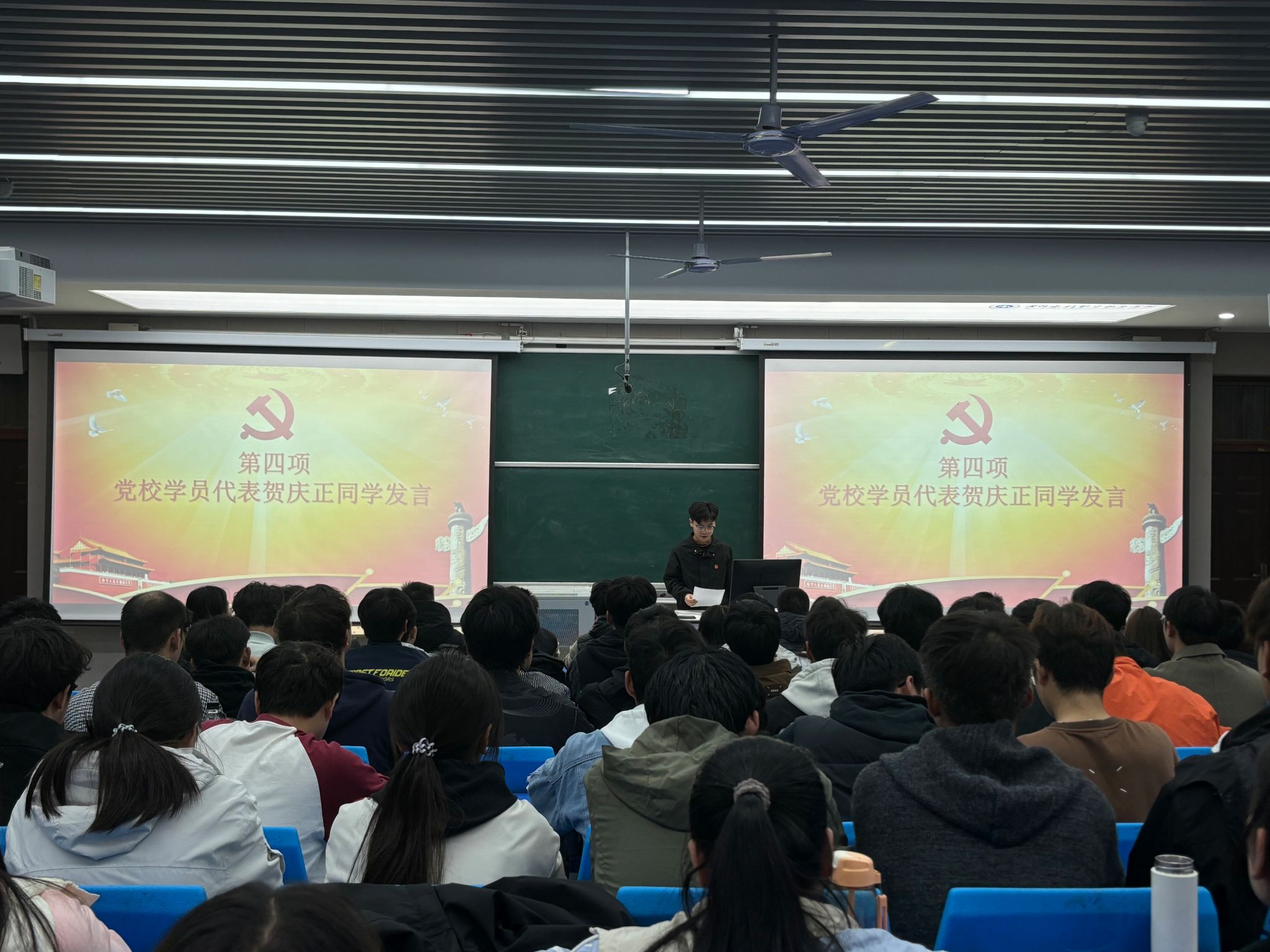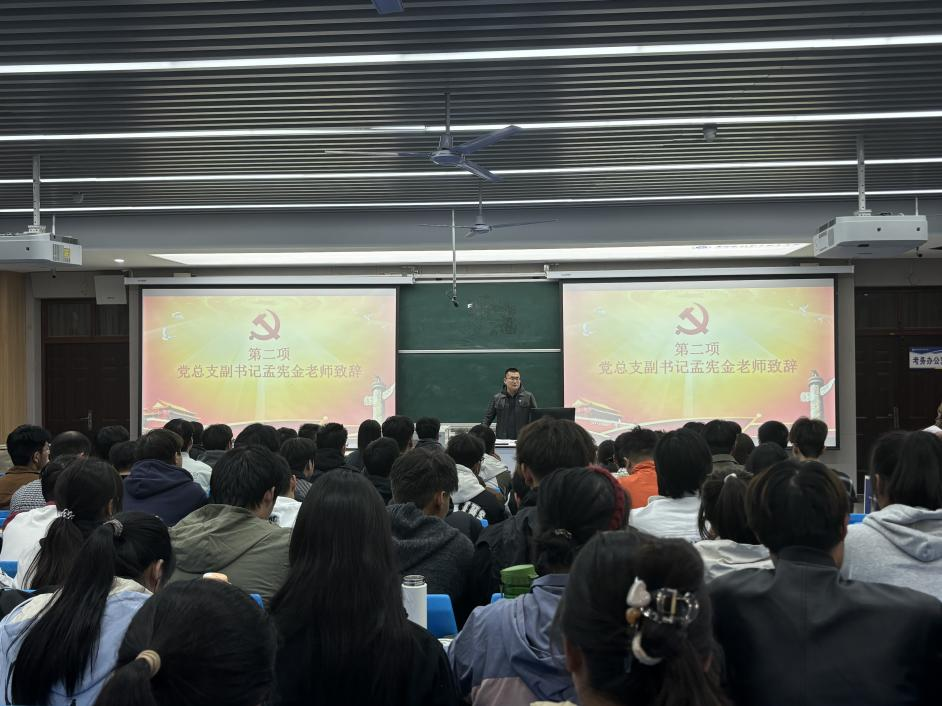 学院党总支副书记孟宪金首先发表致辞。他强调,在当前信息化快速发展的时代背景下,青年学子更应该坚定理想信念,紧跟党的步伐,通过深入学习党的理论知识,不断提升个人的思想政治素养,为实现中华民族伟大复兴的中国梦贡献自己的力量。