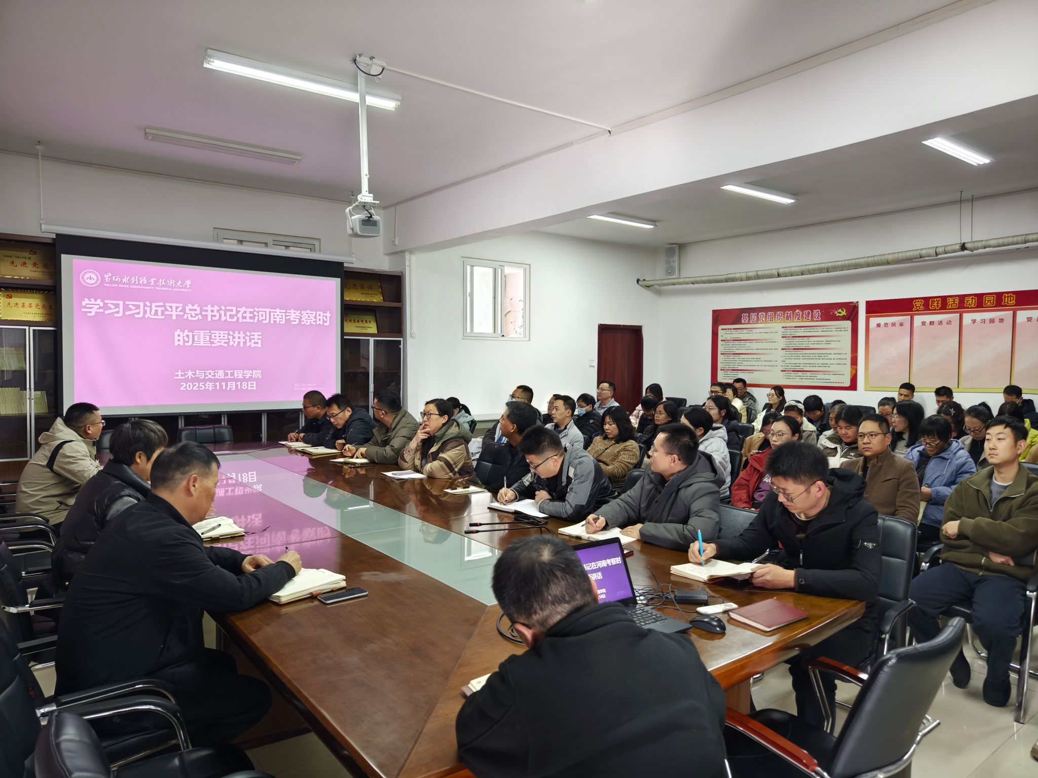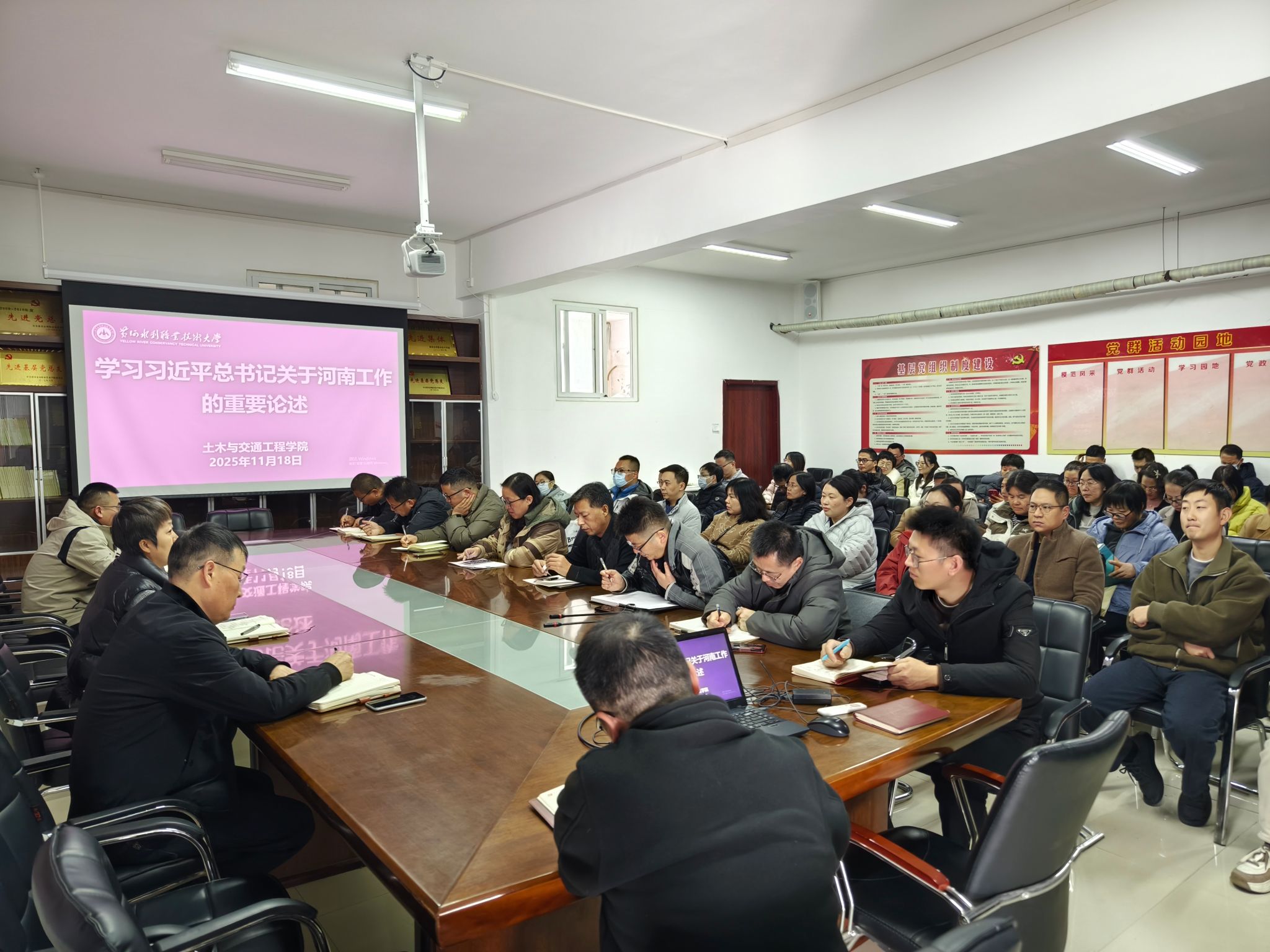 为贯彻落实《黄河水利职业技术大学2025年下半年政治理论学习及思想道德教育计划》学习要求,11月18日,土木与交通工程学院组织教职工传达学习习近平总书记在河南考察时的重要讲话和习近平总书记关于河南工作的重要论述,引导全院教师深刻领会习近平总书记重要讲话精神的核心要义和实践要求,自觉将讲话精神融入日常教学和理论研究工作中,引导广大青年学生坚定理想信念,投身强国建设。