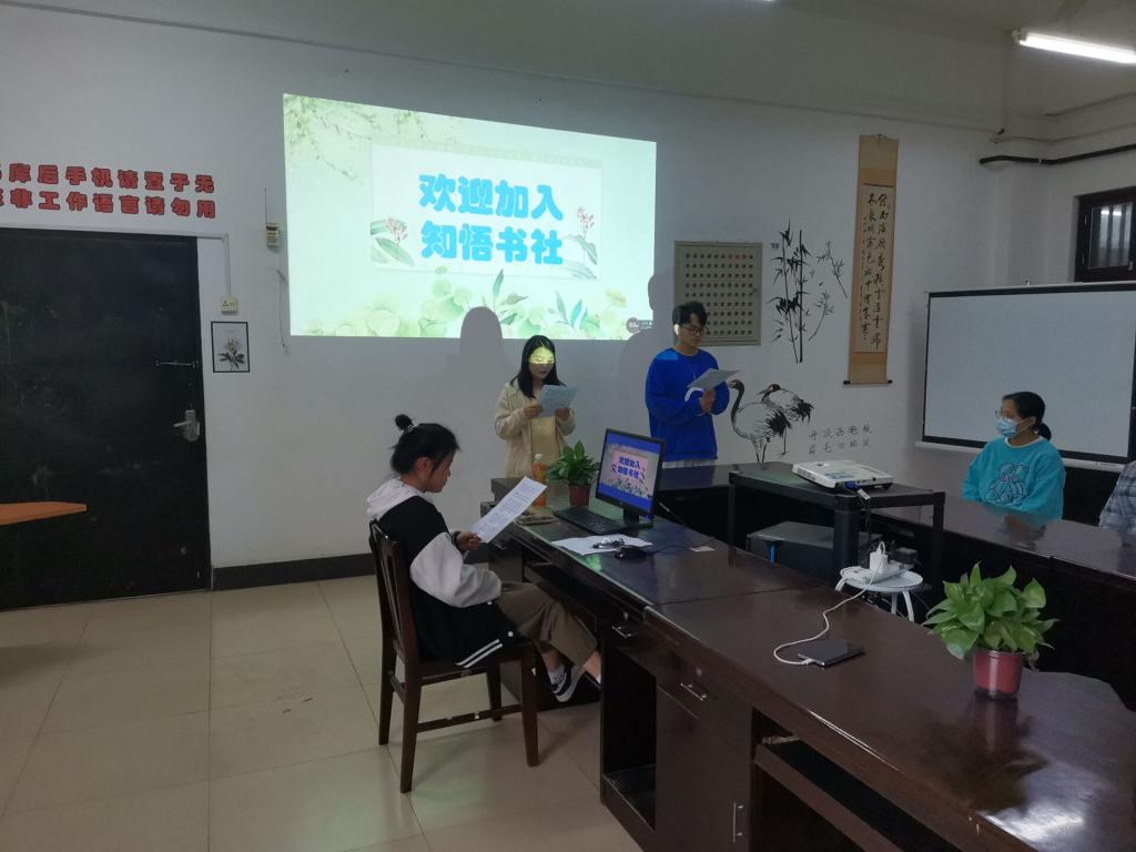 知悟书社直属于校图书馆,图书馆有专门的知悟书屋,是一个思想交流,读书交友,文化传承的综合社团。社团会举办各类文化娱乐活动,如:诗词大会,朗读比赛,演讲比赛,邂逅经典,最美读书人摄影大赛,看电影,游戏派对,文化交流等活动。社团尊重每位社员的建议,按照社员想法发展,多元一体充满机遇,社团创建初衷:给社员精神以及心灵的寄宿,在这里找到你志同道合的一生挚友,在这个社团发挥展示自己的オ能,在大学更进一步成长,为努力奋斗的同学提供优良的平台。