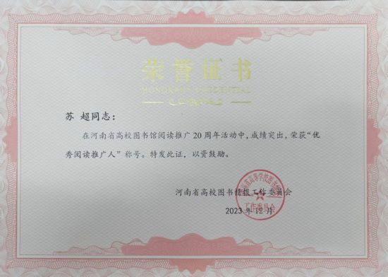 我馆苏超老师荣获“优秀阅读推广人”称号;