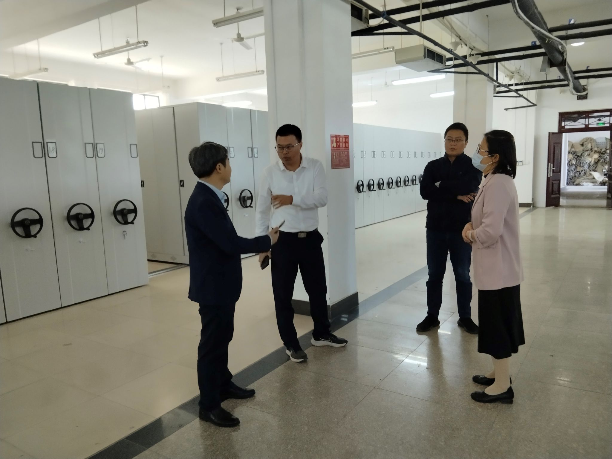 23日上午,胡昊校长一行人在图书馆逐层进行了巡视,重点考察了密集书库的建设和阅览区的使用情况。他指出,图书馆作为文化育人的重要阵地,不断改善学生学习环境,保障学生成长成才。首先,保证图书馆全面开放,增加闸机门禁设施,保持各书库间的便捷、畅通的出入。其次,将图书馆与三号教学楼连通处打通,改造为阅览室,安装窗帘,布置学习桌椅,供师生进行自习和阅览;最后,个别书库书架预留空间较多,应保证图书足量上架,做好为师生阅读服务。