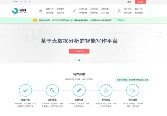 笔杆数据库平台将写作过程划分为:选题分析、资料搜集、在线写作、参考文献、论文查重,专注解决写作各个阶段的问题。该平台从论文选题到查重、投稿等方面构建一个完整的论文写作环节,以数据加服务的形式,同时链接图书馆已有资源,提高图书馆的资源利用效率和学术服务能力。