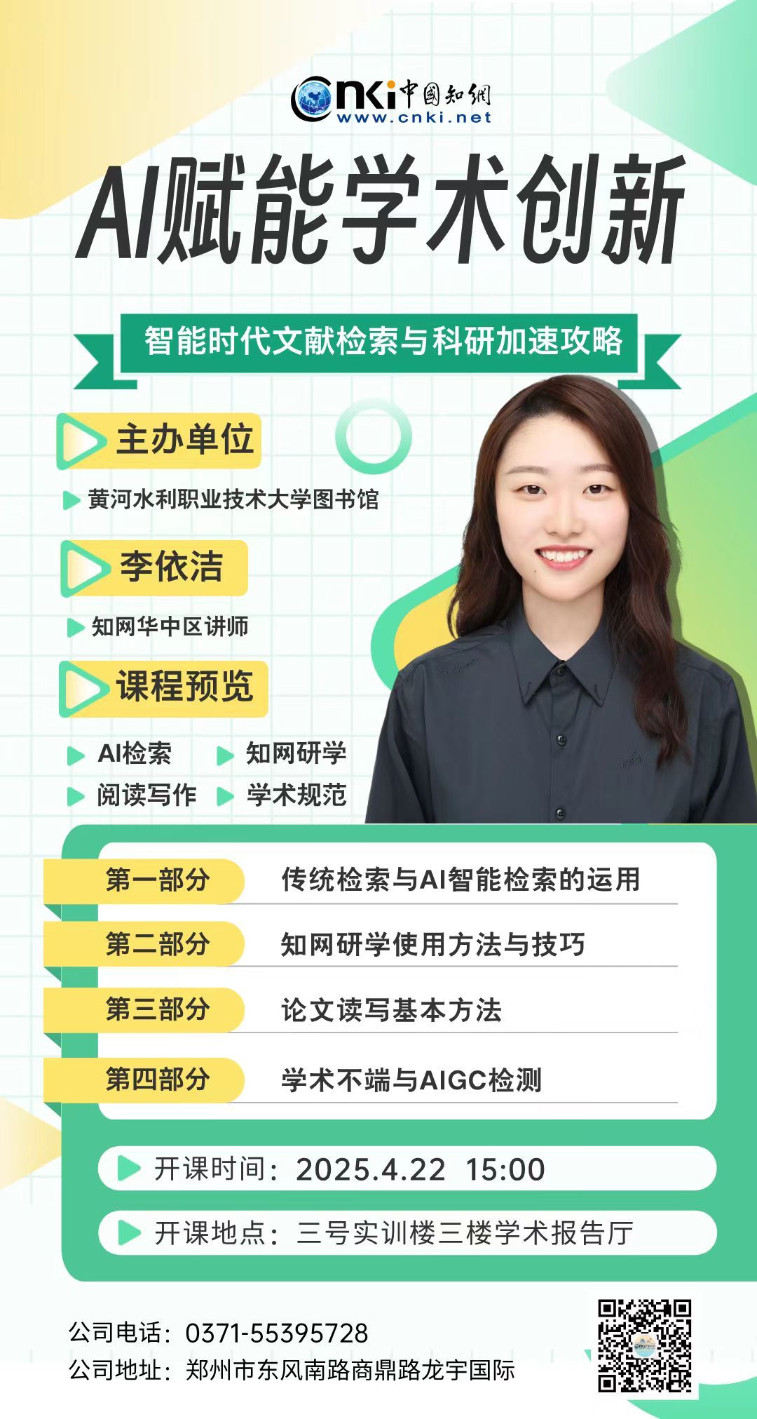 李依洁,中国知网河南分公司培训讲师,从事文献检索、文献阅读、论文写作指导、学术规范等方面的培训工作,擅长培训内容与用户实用相结合,在文献调研方向具有研究,具备较为全面的理论基础与实践经验。