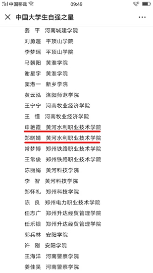 我校高度重视寻访“中国大学生自强之星”活动,把活动作为大学生思想政治教育和共青团工作的重点工作来抓,引导广大青年学生积极进取、拼搏奋进、自立自强、奋发成才,人人争做有理想、有追求、有担当、有作为、有品质、有修养的大学生。活动启动以来,校团委、学生处认真组织、广泛宣传,大力挖掘大学生“自强”典型,最终推送了申艳霞、郑晓婧2名同学参加省级“自强之星”的寻访评选。随后,两名同学成功进入全国“大学生自强之星”寻访评选环节,并最终被评为“中国大学生自强之星”。