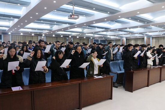 随后,为营造校园良好的学习氛围,发挥学生干部在学风建设中的模范带头作用,校学生会主席王晨光带领学生干部做承诺,并签订《学生干部“讲学习