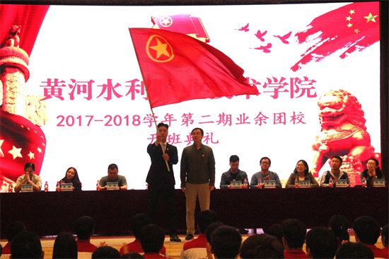 随后,团委副书记范龙向大家提出三点要求及希望:一要明确责任,增强社会责任感和使命感,同学们要立足当前,面向未来勇敢的用实际行动践行党的十九大精神;二要认清自身地位,增强学习的积极性和自觉性,勤奋学习,提高综合素质能力,加强思想理论修养;三要把握好世界观、人生观、价值感,不断拓宽知识视野、优化知识结构,使自己成长为适应社会主义现代化建设需要的应用型、创新性、复合型的人才。并向团校学员代表授团旗。