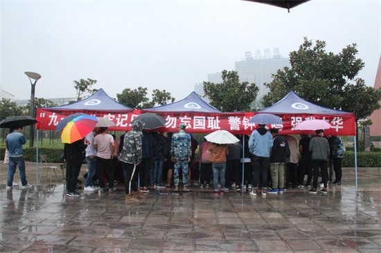 9月18日清晨,我校在明志广场举行以“牢记历史,勿忘国耻,纪念九一八”为主题的大型升旗仪式。校团委全体老师,各院系分团委书记以及全校二百余名学生干部冒雨参加活动。