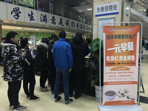 步入学期末,学习月马上开始,一元早餐也隆重升级,为调动同学们的积极性,拒绝懒睡,更好的学习,学习月将开展“135”的早餐活动,即每周一三五,都将提供一元早餐50份。