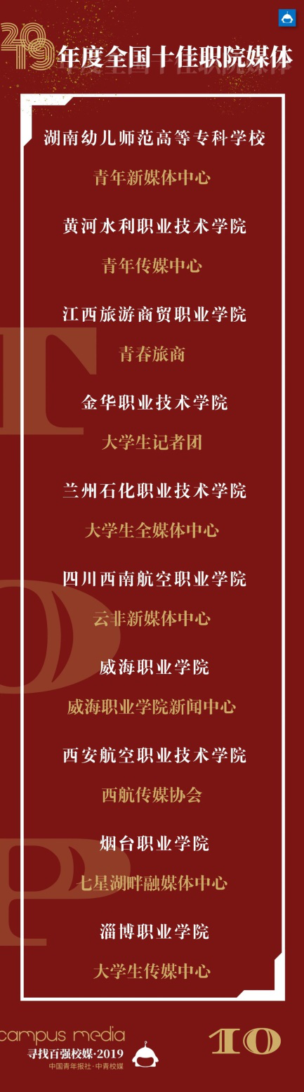 由中国青年报社、中青校媒主办的“2019年度寻找全国百强校园媒体”活动自 2019 年10月举办以来,经过网上巡展、受众投票、专家评审等环节已圆满结束。我校团委青年传媒中心从全国参评的1200余家高校校园媒体中脱颖而出,荣获“2019年度全国十佳职院媒体”称号。