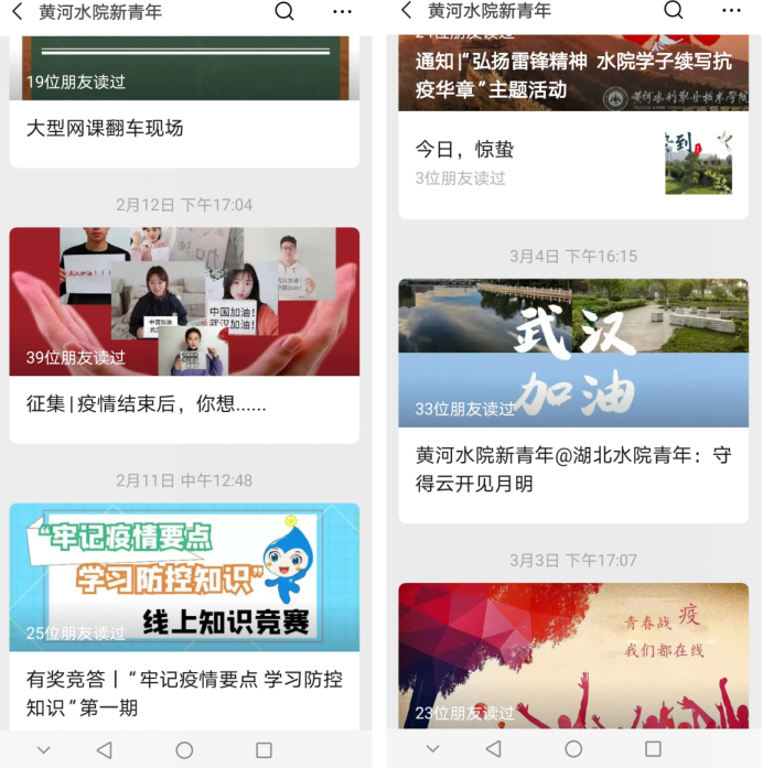 1月26日,校团委利用“黄河水院新青年”微信公众号转发了共青团中央办公厅《关于立即行动起来投身新型冠状病毒感染肺炎疫情防控工作的通知》,号召水院学子为防控疫情做好准备。随后,“黄河水院新青年”微信公众号发布了疫情防控自我防护知识宣传、政策解读、各级文件通知、疫情辟谣信息、网上团课、在线教学等各种信息,同时还发布了一系列主题专栏,介绍和展示抗疫故事:“众志成城战疫情,水院青年勇担当”专栏,介绍奋战在抗疫一线的我校优秀学子;“牢记疫情要点,学习防控知识”专栏,发布防疫知识供学生学习;“疫情结束后,你想……”专栏,征集并展示同学们对疫情结束后的美好生活的畅想;“奋战疫情,我们与祖国同在”专栏,征集并展示同学们与全国人民一起抗疫的作品;“弘扬雷锋精神,水院学子续写抗疫华章”专栏,号召并征集学生们践行雷锋精神的事迹与感想……截止目前,校团委在“黄河水院新青年”微信公众号上共发布了54篇疫情相关的推送文章,收到了学生们的好评,带动了一大批青年学子自觉参与到各条战线的抗疫活动中来。