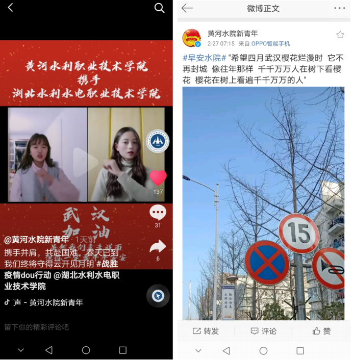 经过前期的沟通和协调,3月4日,校团委联合湖北水利水电职业技术学院在微信公众号上展开联动,发布了“黄河水院青年@湖北水院青年:守得云开见明月”微信推送,并在随后的几天中陆续在QQ、微博、抖音上发布了联动内容,获得了两校青年学生的好评。