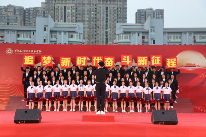 下午17时整,12个学院和校艺术团合唱队带来的合唱展演在扬帆广场拉开帷幕。全体校领导、相关部门、学院的师生一起观看了展演,展演共分为四个篇章祝福祖国、强军报国、中流砥柱、展望未来。同学们意气风发、歌声嘹亮,唱出了自豪与骄傲,在《歌唱祖国》、《我和我的祖国》、《国家》等歌曲的深情演绎中,全校学生共同欢庆国庆、中秋佳节的到来。在一曲《今天是你生日》合唱之后,主持人特意邀请10月1日当天生日的同学们一起上台,与大家共同分享生日感想,周书记和祝校长还上台为当天生日的同学切蛋糕、发蛋糕,大家一起为这些同学送上生日祝福,也一起祝福祖国母亲生日快乐。最后,现场全体人员齐唱《黄河水利职业技术学院校歌》,在嘹亮的歌声中,本次“庆国庆 迎中秋 我陪学生过双节”系列活动顺利拉上帷幕。演出结束后,校领导上台与演职人员一起合影留念。