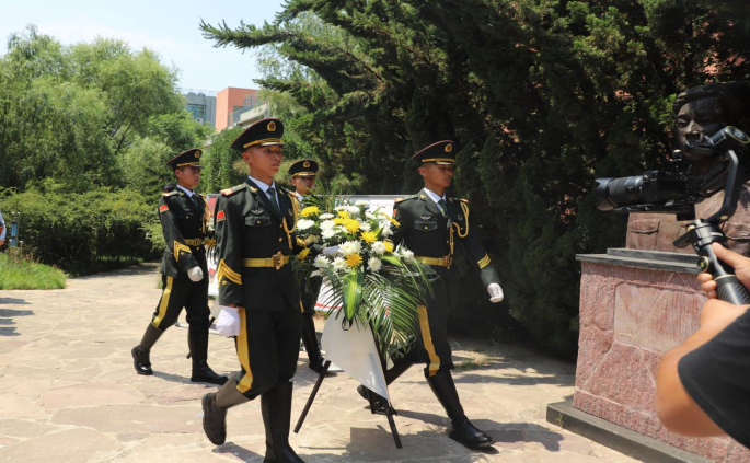 活动中,伴随着雄浑激昂的《义勇军进行曲》,全场垂首肃立、静默无声。国歌奏罢,国旗护卫队队员迈着整齐的步伐,向革命英烈敬献花篮,在场人员面向烈士雕像三鞠躬致以崇高敬意。