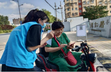 王金梦瑶在复兴社区当志愿者引导居民扫描场所码