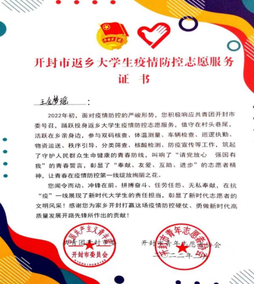 2022年暑期,她积极响应学校的号召,投身于大学生“向基层报到”社会实践活动,报名参加了开封市示范区返乡实践,并被分配到了晋安社区参与了五星级团支部创建工作、疫情防控工作以及全民核酸检测志愿服务工作等。在进行全民核酸检测时,她协助社区成员提醒居民戴口罩、扫场所码,帮助老人填写场所码。2022年7月30日,面对开封市疫情防控最为严峻的时刻,她也曾害怕与彷徨,但她想到周围那么多白衣天使、社区一线防控工作人员都不惧个人安危,因此克服了心中的恐惧,投身到社区管控和全员核酸检测工作中去。她引导居民做好个人防护(戴口罩),主动配合工作人员做好扫码测温、登记信息等工作。她说:“为期一个月的实践不仅让我更为深刻的了解我的家乡,也让我深入地明白了基层社区的工作内容与形式。大学不仅要认真学习课本里的知识,更要通过实践了解社会,从而不断的丰富与提升自己。习近平总书记对我们青年人寄语‘未来属于青年,希望寄予青年,国家的希望在青年,民族的未来在青年’,我们正处于青年时代,要奋力奔跑,拼搏奋斗,将自己的梦想融入祖国发展之中。”我们正处于青年时代,要奋力奔跑,拼搏奋斗,将自己的梦想融入祖国发展之中。”