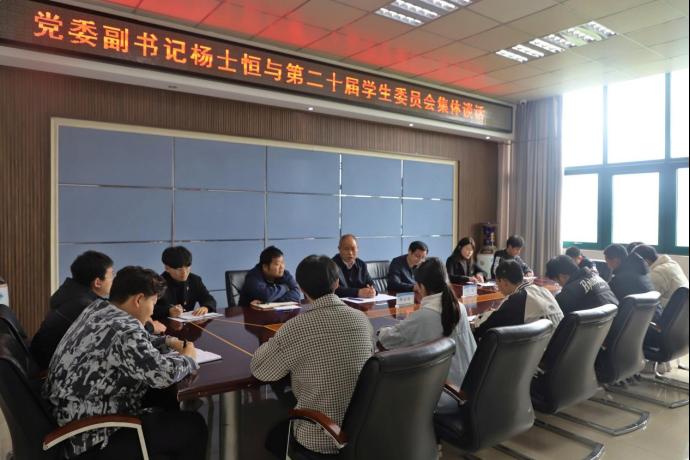 杨士恒认真听取了同学们的发言,与同学们深入交流,充分肯定了同学们对学生会工作的深入思考,他表示,学生会是党联系广大青年的重要载体,他对学生会过去一年所取得的工作成绩予以肯定,并向第二十届学生委员会提出三点要求,一是坚持不忘初心,融入思想引领工作的“大格局”。学生会要准确地将党的声音和主张,用青年学生乐于接受的方式传递给同学,引导广大同学把个人理想融入到党和人民的共同奋斗之中,把青年学生最广泛最紧密地团结在党的周围;二是当好桥梁纽带,共筑学校人才培养的“共同体”。学生会要积极围绕青年需求和学校发展建言献策,聚焦立德树人这一根本任务,针对学校的各类工作传递学生声音,提出意见建议,为学校改革发展贡献青春智慧;三是要有强执行力,塑造干部奋发有为的“好形象”。学生会要围绕自身建设下工夫,从日常管理、工作开展、作风建设等方面开展评议监督,提出改进意见,推动学生会更好履行职能,树立学生干部奋发有为的良好形象。