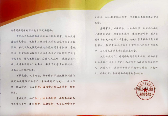 近日,由共青团中央、全国学联指导,中国青年报社等联合举办的2022年度“中国大学生自强之星”奖学金评选活动结果揭晓。经学校推荐、省级初评、全国评审等环节,我校水文与水资源技术2102班刘桥桥同学荣获2022年度“中国大学生自强之星”称号。