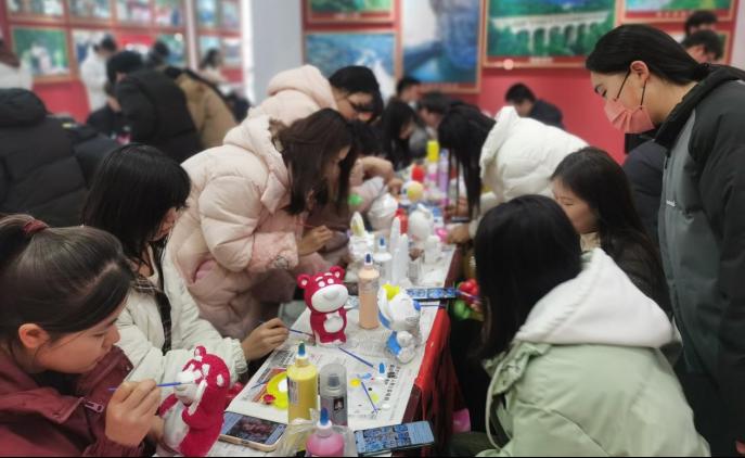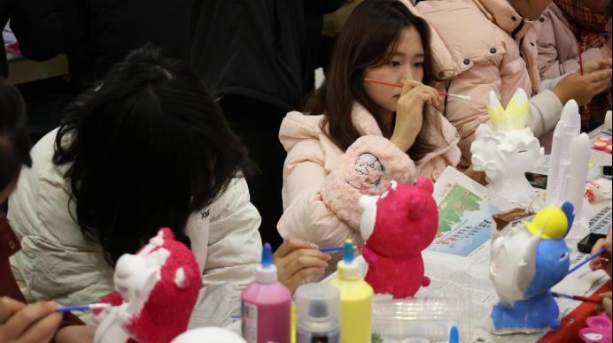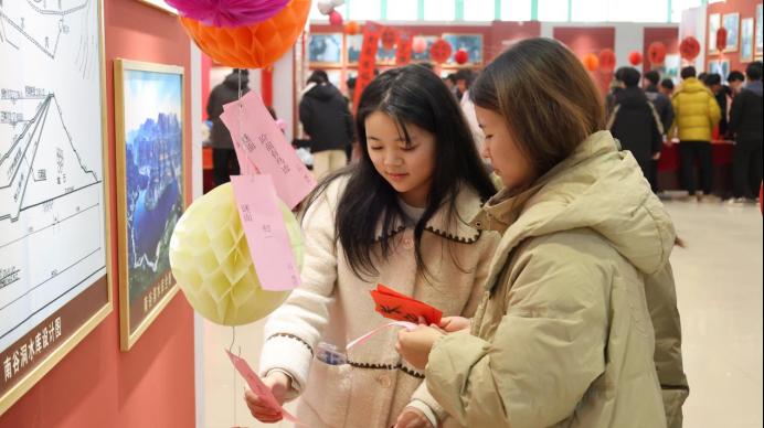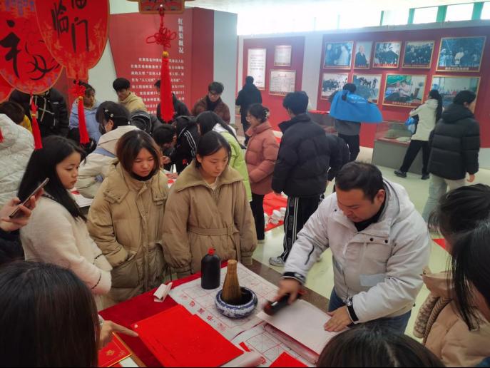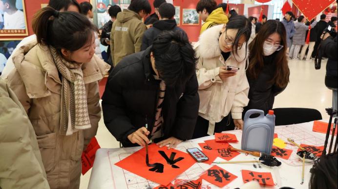 同学们穿梭在会场中,体验着不同的游艺活动:毛笔字、木版画、猜灯谜……现场喜气洋洋、热闹非凡!
