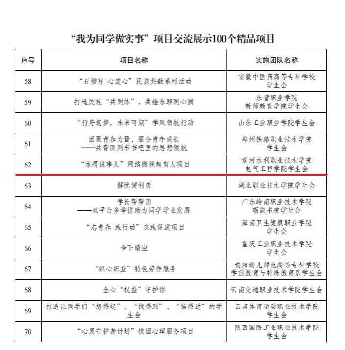 3月21日—24日,由共青团中央指导,全国学联主办、贵州省学联承办的全国高校学生会组织“我为同学做实事”项目交流展示活动在贵州师范大学举办,我校学生会组织《“水哥说事儿”网络微视频育人项目》揽获“全国优秀项目”“全国100个精品项目”“全国100个最受欢迎项目”等多项荣誉,是唯一获得三项荣誉的河南省高校。