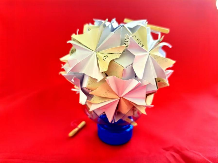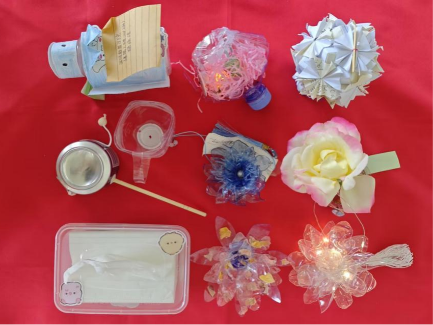 “创意新生 废品焕彩”变废为宝活动中,同学们收集废旧纸张、塑料瓶、废旧布料等生活废弃物,他们将奇思妙想融入指尖创作,将废弃材料转化为具有实用或装饰价值的艺术品。有的同学将塑料瓶剪裁拼接,制作出分层式收纳盒,兼具实用与美观;有的把旧布料与竹筷结合,缝制出憨态可掬的布艺拨浪鼓;还有人用废旧宣纸与LED灯带打造出会旋转的“莲花灯”,在暮色中绽放别样光彩。在创作过程中,同学们深刻理解到环保行动的重要性,并表示以后将更加重视资源节约与垃圾分类,以实际行动为建设美丽校园、美好家园贡献力量。