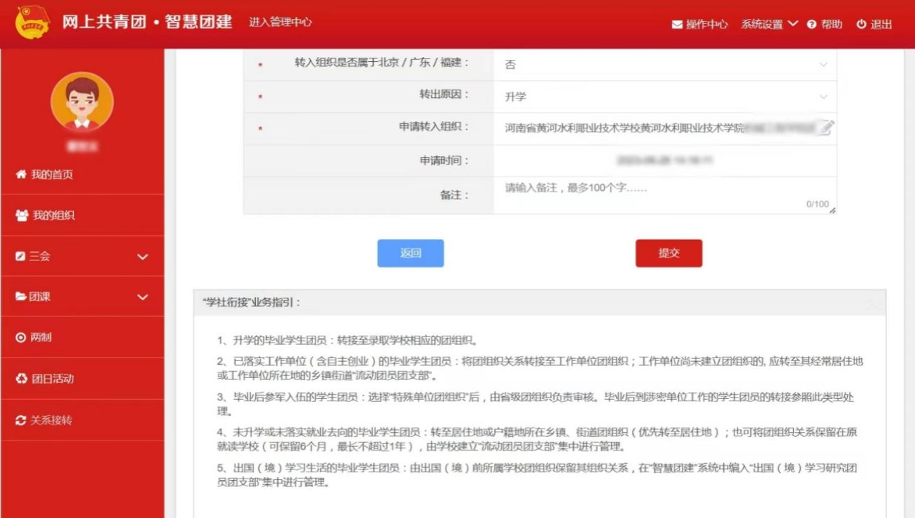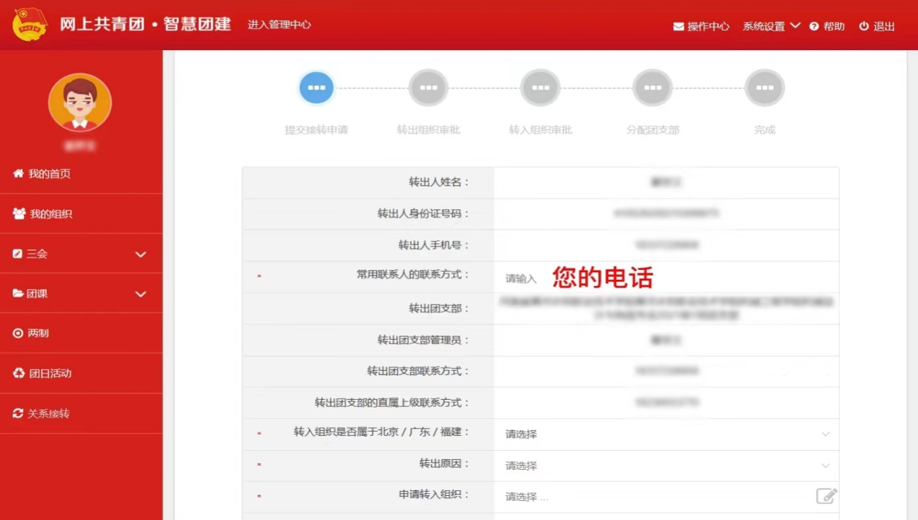 (四)转入组织是否属于北京/广东/福建,选择“否”,转接原因选择“升学”