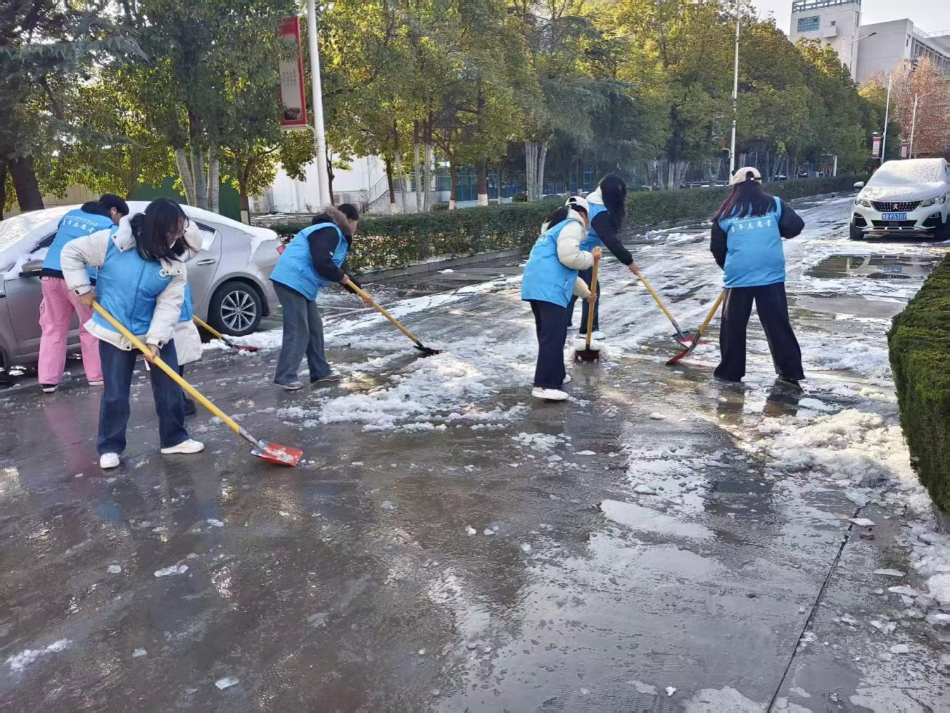 为应对近期持续低温降雪天气带来的校园安全隐患,切实保障校内道路畅通及师生出行安全,12月13日,我校青年志愿者协会迅速响应,组织50余名志愿者开展扫雪除冰志愿服务活动,为师生行走提供便利,助力平安校园建设。