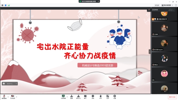 为引导广大青年学生积极响应配合学校疫情防控工作,助力打赢校园疫情防控阻击战,营造宿舍良好学习氛围,10月27日—31日,我校全体团支部线上开展”宅出水院正能量,齐心协力战疫情“特别主题团日活动。