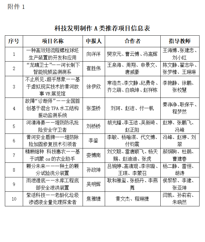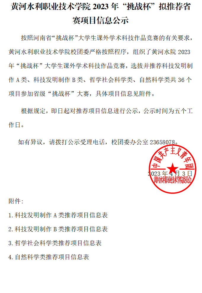 黄河水利职业技术学院2023年“挑战杯”拟推荐省赛项目信息公示