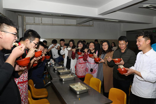 老师与同学们分工合作,和面、擀皮、包饺子,各显身手。大家围在一起,像家人一样不时地交谈着、嬉闹着,整个食堂都洋溢着幸福的味道;包饺子组的老师和同学们热情的聊着天,各自都别出心裁地把饺子设计成不同的形状,有的似元宝,有的似小笼包,还有的是小巧的柳叶饺等。人多力量大,在大家的共同努力下很快就包好了一盘盘饺子,大家吃着刚出锅的热气腾腾、香气四溢的饺子都开心的合不拢嘴。