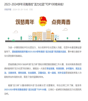 3月29日,共青团河南省委公布2023-2024学年高校“活力社团”风采展示活动评选结果,我校机械兵团创业者协会、CAD协会、跆拳道协会三个学生社团入选河南省高校“活力社团”TOP100榜,是入围榜单社团数量最多的高职院校。