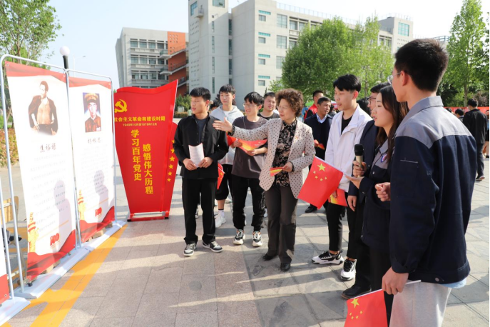 活动期间,党委书记周保平来到活动现场,询问同学们参与活动的情况和感受,并与同学们亲切互动,合影留念。她对活动的开展给予充分的肯定,并强调了学习党史的重要意义,希望青年学生以活动为契机,认真学习党史,铭记党的光辉历史,传承红色基因,在党史学习中汲取奋斗的力量,自觉把个人的理想追求融入党和国家事业之中,为实现“第二个百年奋斗目标”贡献自己的青春力量,让青春在党和人民最需要的地方绽放。